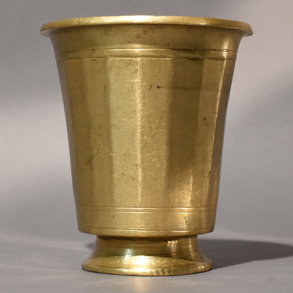 This vintage style solid brass ritual tumbler reflects traditional Indian metal craftsmanship with a strong, structured silhouette and timeless appeal. Designed with a broad flared rim and a slightly tapered body, the tumbler rests securely on a thick circular base that enhances stability and presence. The clean vertical paneling effect on the surface gives it a refined architectural look while maintaining simplicity. The warm golden tone of brass is enriched by natural patina marks and subtle surface variations, emphasizing its authentic character. Fine horizontal band detailing near the rim and base adds understated ornamentation, making it suitable for both ceremonial and everyday use. The interior is smoothly finished, ensuring practical functionality for serving water, milk, herbal drinks, or sacred offerings. Brass drinkware has long been associated with traditional dining and ritual practices in Indian households. This handcrafted tumbler fits seamlessly into pooja settings, festive gatherings, temple use, or heritage-inspired table arrangements. Its sturdy pedestal base gives it a more elevated appearance compared to regular tumblers, adding ceremonial elegance. Made from solid brass using traditional shaping techniques, this piece offers durability and long-term usability. Over time, the surface develops a richer tone, enhancing its antique character while preserving structural strength.