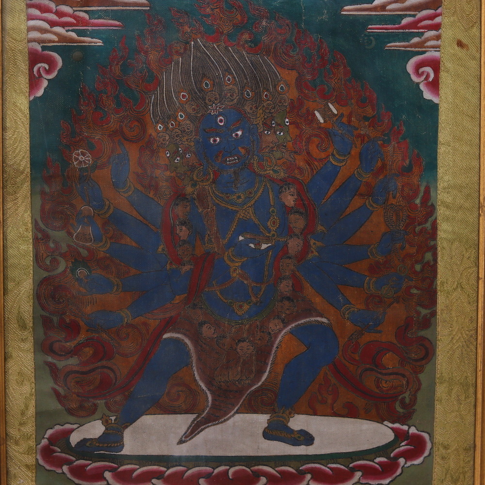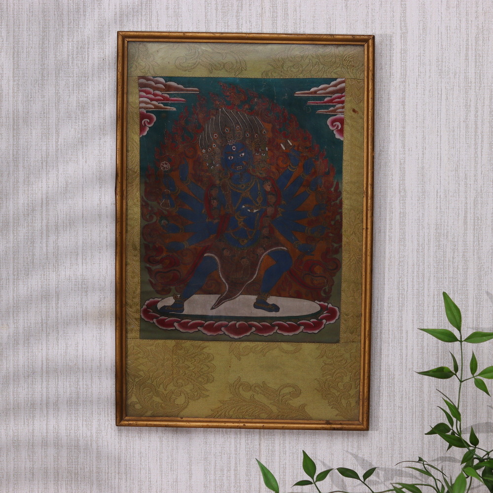 Discover the Timeless Majesty of Lord Shiva in This Stunning Vintage Tibetan Thangka Painting This vintage Tibetan thangka painting of Lord Shiva is a captivating work of art that transports you to the heart of Himalayan spirituality. Meticulously crafted by skilled Tibetan artisans, the painting's vivid hues and mesmerizing details have been beautifully preserved, offering a glimpse into the rich cultural heritage of Tibet. The central figure of Lord Shiva, the Hindu deity of destruction and transformation, is depicted in all his powerful glory. Surrounded by intricate mandalas and symbolic elements, the painting radiates an aura of mysticism and divine energy. Hanging this thangka in your home or office creates a serene and contemplative atmosphere, inviting you to connect with the timeless wisdom of Tibetan Buddhist teachings. Whether you are an art enthusiast, a spiritual seeker, or someone drawn to the allure of Himalayan culture, this vintage Tibetan thangka painting of Lord Shiva will be a cherished addition to your collection. Framed in a stunning wooden frame, this piece of art will elevate the aesthetic and spiritual ambiance of any space, serving as a constant reminder of the enduring power of faith, enlightenment, and the human spirit.