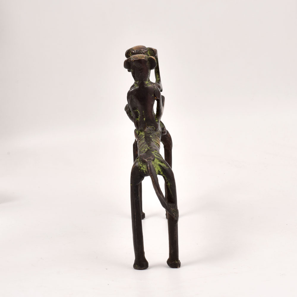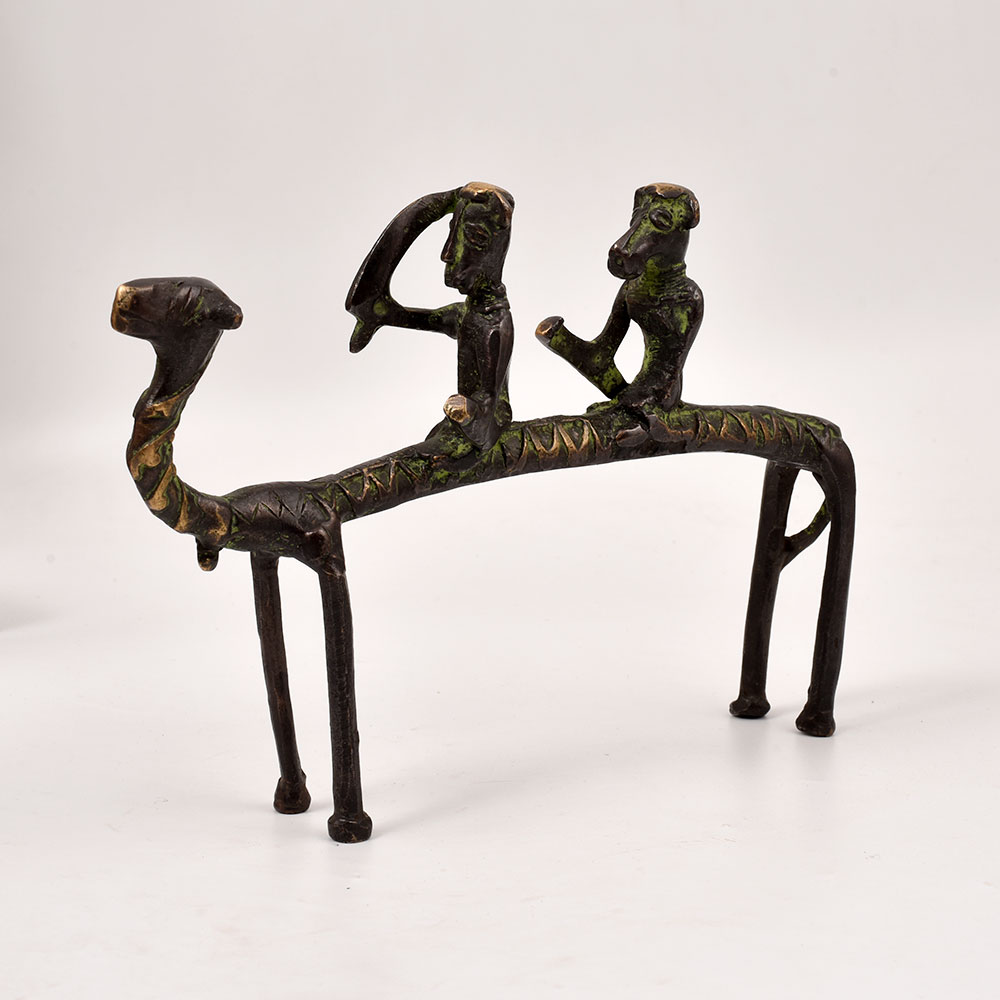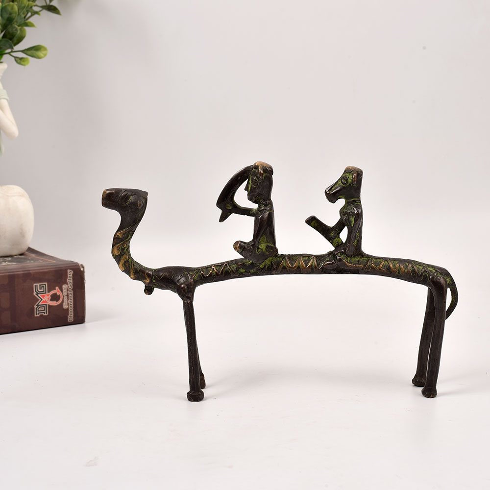Embark on a journey to the heart of the Arabian desert with this breathtaking brass camel sculpture. Meticulously crafted by skilled artisans, this piece showcases the timeless beauty and rich heritage of tribal art. The solid brass construction ensures it will withstand the test of time, while the two riders atop the camel's back add an authentic, adventurous touch. Perfect for decorating living rooms, studies, or entryways, this captivating sculpture will transport you to a world of mystique and wonder. Place it on a shelf, tabletop, or mantle, and let its intricate details captivate all who lay eyes upon it. Whether you're a collector of tribal art or simply seeking to infuse your space with a touch of exotic charm, this brass camel is a must-have addition to your home.
