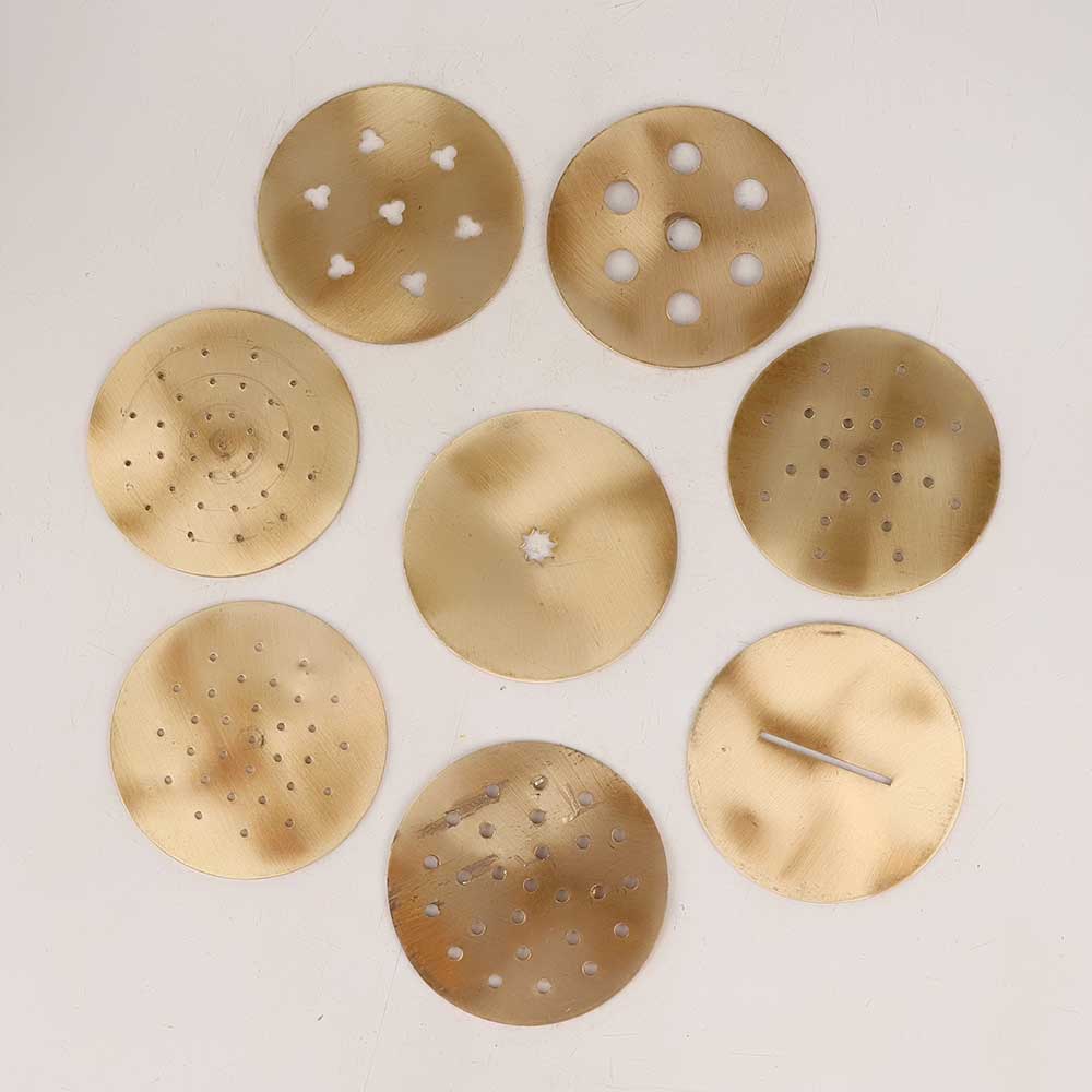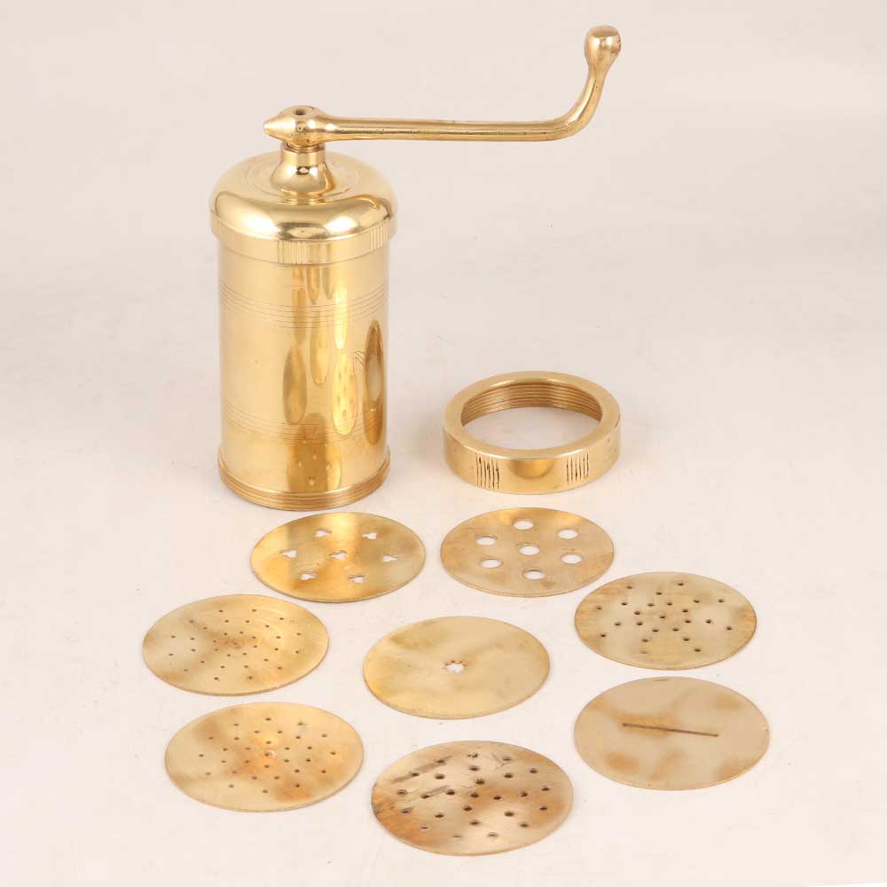 This vintage brass kitchen utensil is an artistic masterpiece crafted with precision and love by highly skilled and experienced Indian artisans. This timeless piece harks back to the golden era of culinary craftsmanship, adding a touch of old-world charm to any setting. Fashioned from high-quality brass, this kitchen utensil boasts a lustrous golden finish, reflecting the brilliance of its handmade creation. Originally designed for making noodles, we now recommend it for decorative purposes only due to its age and historical significance. Its alluring appearance makes it a versatile addition to various spaces, whether it be adorning the kitchen shelf at home, adding elegance to the office space, enhancing the ambiance of a restaurant, hotel, or cafe, or serving as a captivating display at exhibitions. It perfectly complements vintage collections, becoming a cherished centerpiece that sparks conversations and fond memories. Additionally, this ornamental piece is an ideal gift for your loved ones on special, festive, or auspicious occasions.
