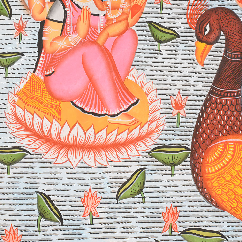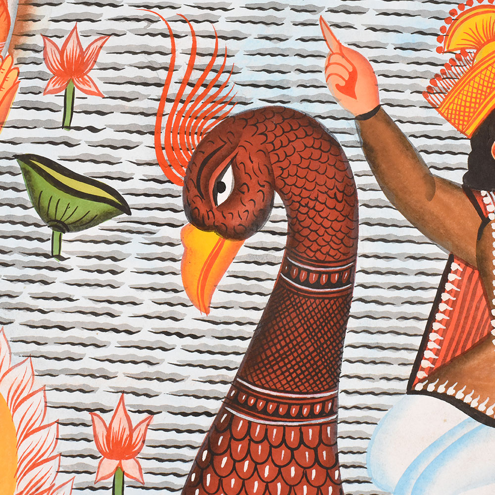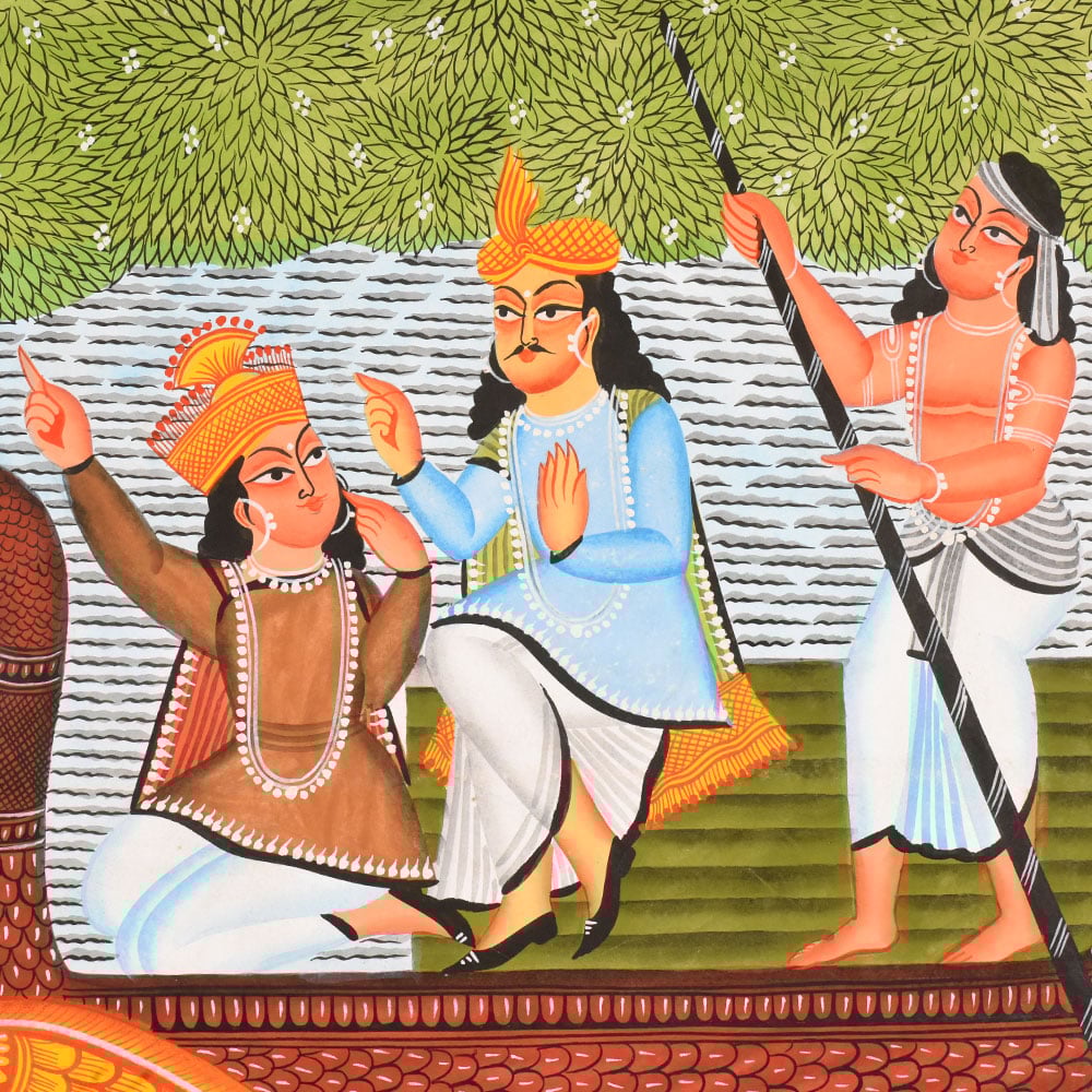 This Kalighat painting on cloth and paper narrates a serene yet symbolically rich mythological scene set upon flowing waters, rendered in the distinctive folk idiom of the Kalighat tradition. At the left, a divine coupleLord Vishnu and Goddess Lakshmiare seated together on a blooming lotus that floats effortlessly on the rivers surface. Vishnus calm blue-toned face and Lakshmis gentle posture convey harmony, protection, and abundance. A soft halo around them emphasizes their divine status, separating them visually from the earthly realm. Dominating the foreground is a large, stylized makara-shaped boat, its body richly patterned in warm reds, oranges, and golds. The boat glides across the water carrying three royal or noble figures, each shown with expressive gestures and distinct attire. One figure points forward, suggesting direction or destiny, while another sits attentively, and a boatman stands at the rear with a long oar, guiding the vessel. Their exaggerated eyes, simplified anatomy, and rhythmic poses are hallmarks of Kalighat painting, prioritizing storytelling over realism. The water is depicted through repetitive horizontal lines, dotted with lotus buds and leaves that create visual rhythm across the composition. Above, dense green foliage stretches across the background, forming a natural canopy that frames the scene and balances the vibrant activity below. Bold outlines, flat areas of color, and a decorative border enclose the painting, reinforcing its folk-art character. Executed on cloth and paper, the work beautifully blends divine presence with a narrative journey, reflecting Kalighat artists ability to bring mythology into intimate, accessible visual form.