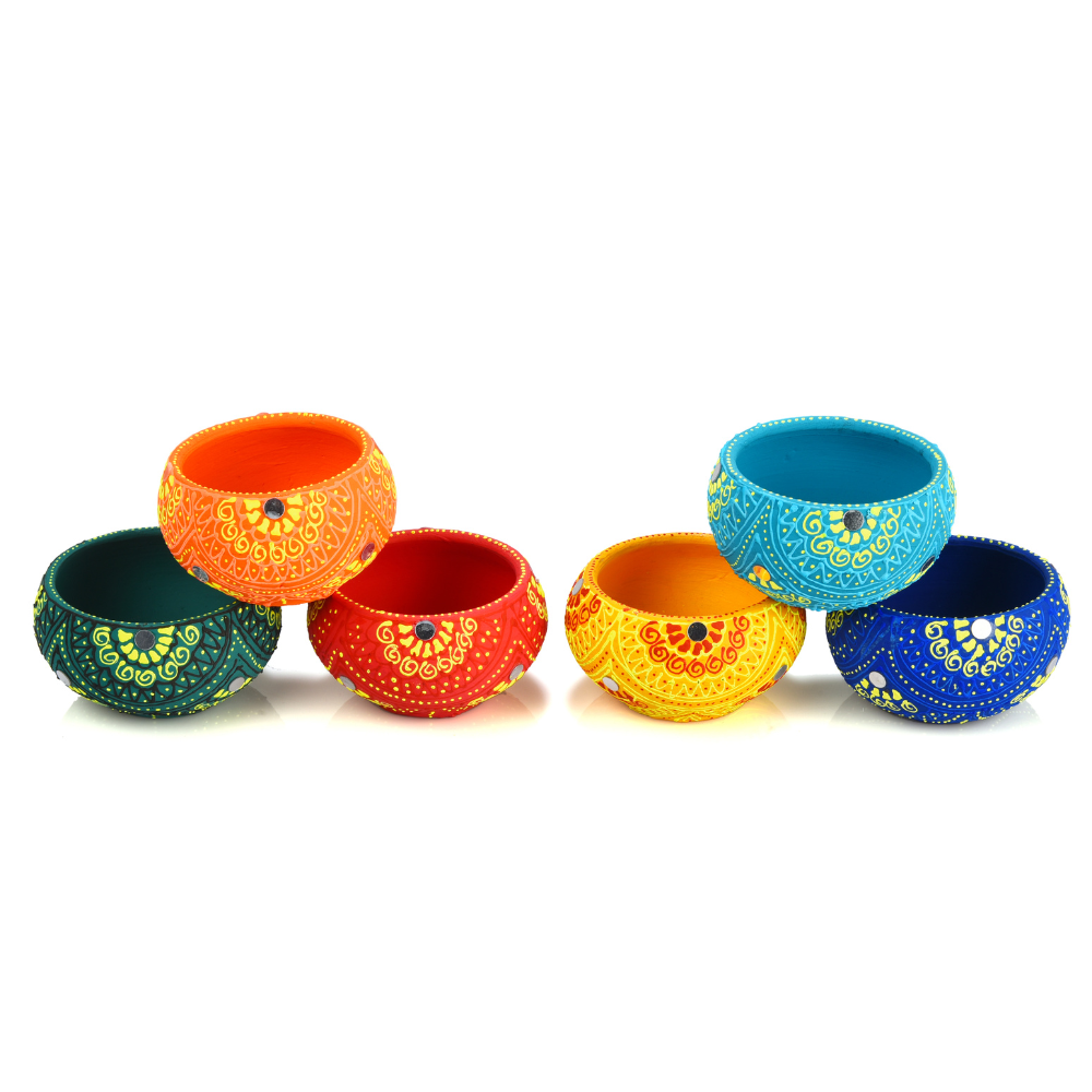 Add timeless charm to your celebrations with the Handmade Terracotta Round Diya, a classic design reimagined in festive colors. Painted in bright shades of yellow, orange, red, blue, green, and turquoise, this diya brings cultural warmth and vibrant energy to your puja space and home décor. Its round bowl shape ensures a steady flame, perfect for rituals and decoration.
