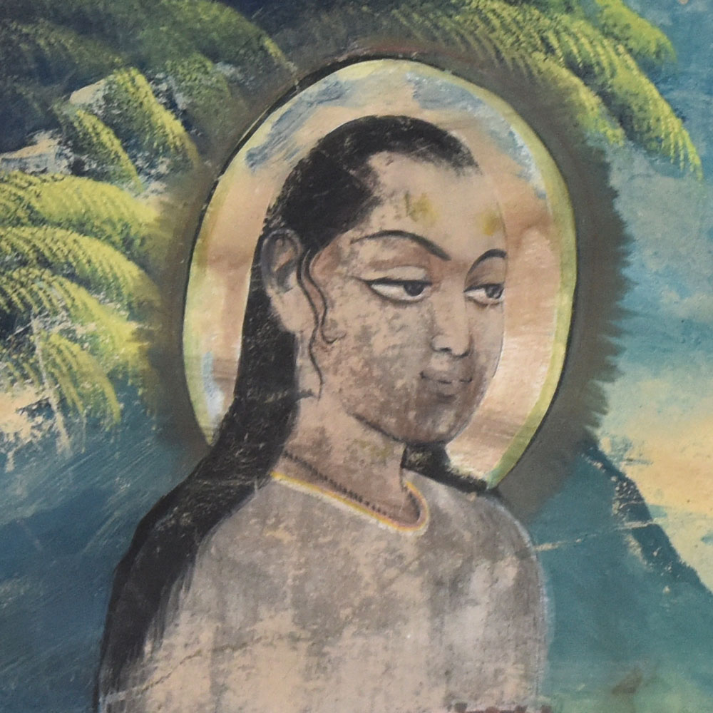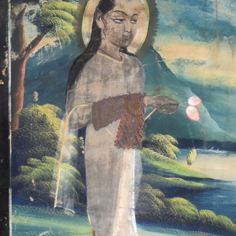 Bring home divine grace with this watercolor paper painting of Shrinath Ji, beautifully framed in a rustic wooden border. The artwork depicts Shrinath Ji in a serene posture, holding a lotus flower, surrounded by a scenic backdrop of lush green hills, trees, and a calm river. Painted with soft brushstrokes and delicate detailing, the composition reflects the devotional charm and artistic depth of Nathdwara-inspired paintings. The halo around Shrinath Ji enhances the spiritual aura, while lotus flowers at his feet symbolize purity and devotion. Rendered in soothing shades of green, blue, and white, the painting radiates peace and blessings, making it an ideal addition to pooja rooms, meditation spaces, or as a devotional centerpiece in your home. This timeless artwork is also a thoughtful gift for weddings, festivals, and spiritual occasions.