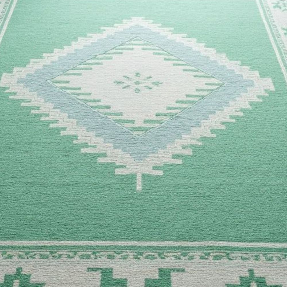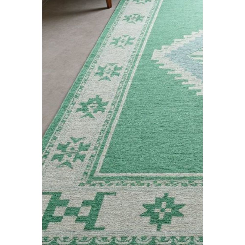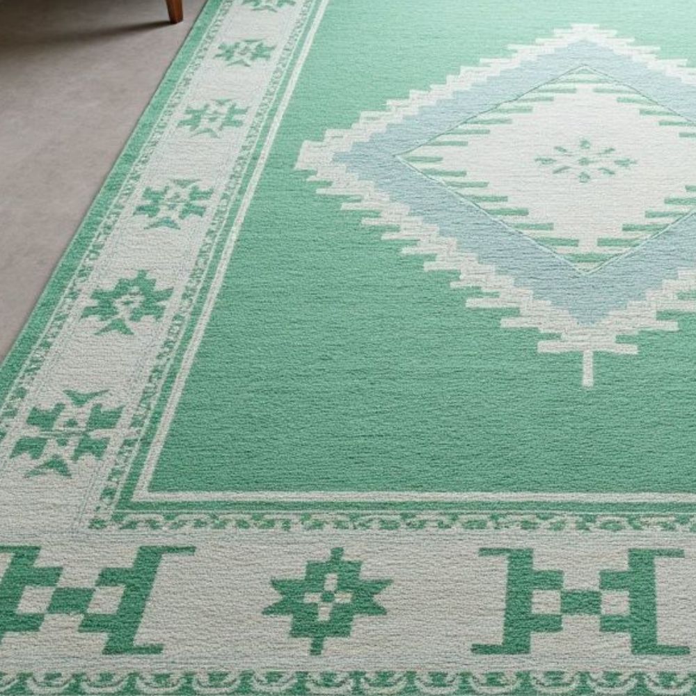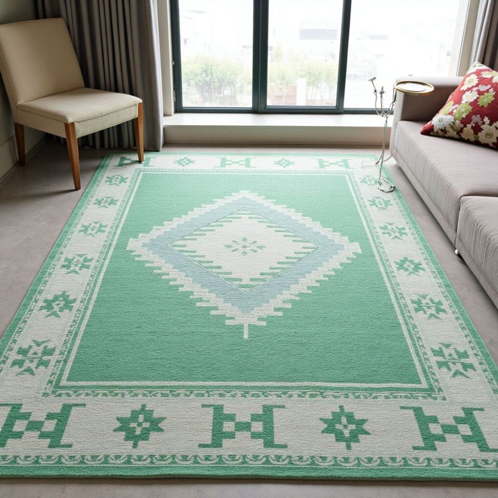 Bring timeless beauty to your home with this handmade wool area rug, crafted by skilled artisans using traditional techniques. Featuring a soothing mint green background with ivory diamond medallion and tribal border, this rug adds warmth, elegance, and cultural charm to any space. Design & Style Central diamond medallion with geometric tribal motifs Minimal yet bold pattern that works with both modern and boho interiors Material & Quality 100% natural wool for softness and durability Handmade by skilled artisans with generations of rug-making heritage Eco-friendly and sustainable choice for conscious homes Perfect For Living rooms, bedrooms, nurseries, and lounge areas Modern, bohemian, Scandinavian, and eclectic home dcor Sizes Available 4x6 ft | 5x8 ft | 6x9 ft | 8x10 ft and more. (Custom sizes available on request) Why Choose This Rug? Adds instant coziness & sophistication Plush, soft feel underfoot Durable & long-lasting investment piece Each rug is unique, hand-knotted with care, making it not just a home accessory but a work of art. As it Appears Pack of One Piece.