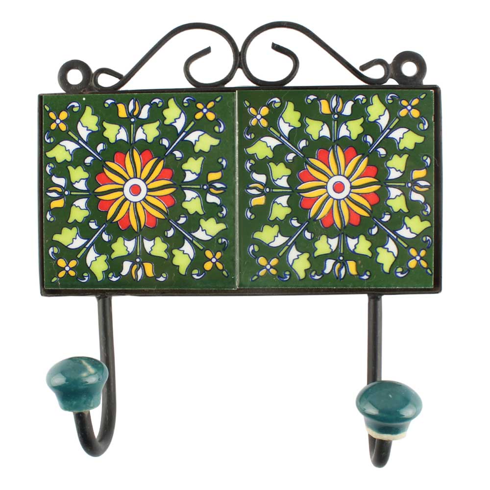 Wheel Flower Ceramic Tile Wall Hook in Forest Green. When Put on Wall or Cabinet It is An Art in Itself. The Metal Part of this Hook is Black Powder Coated.
