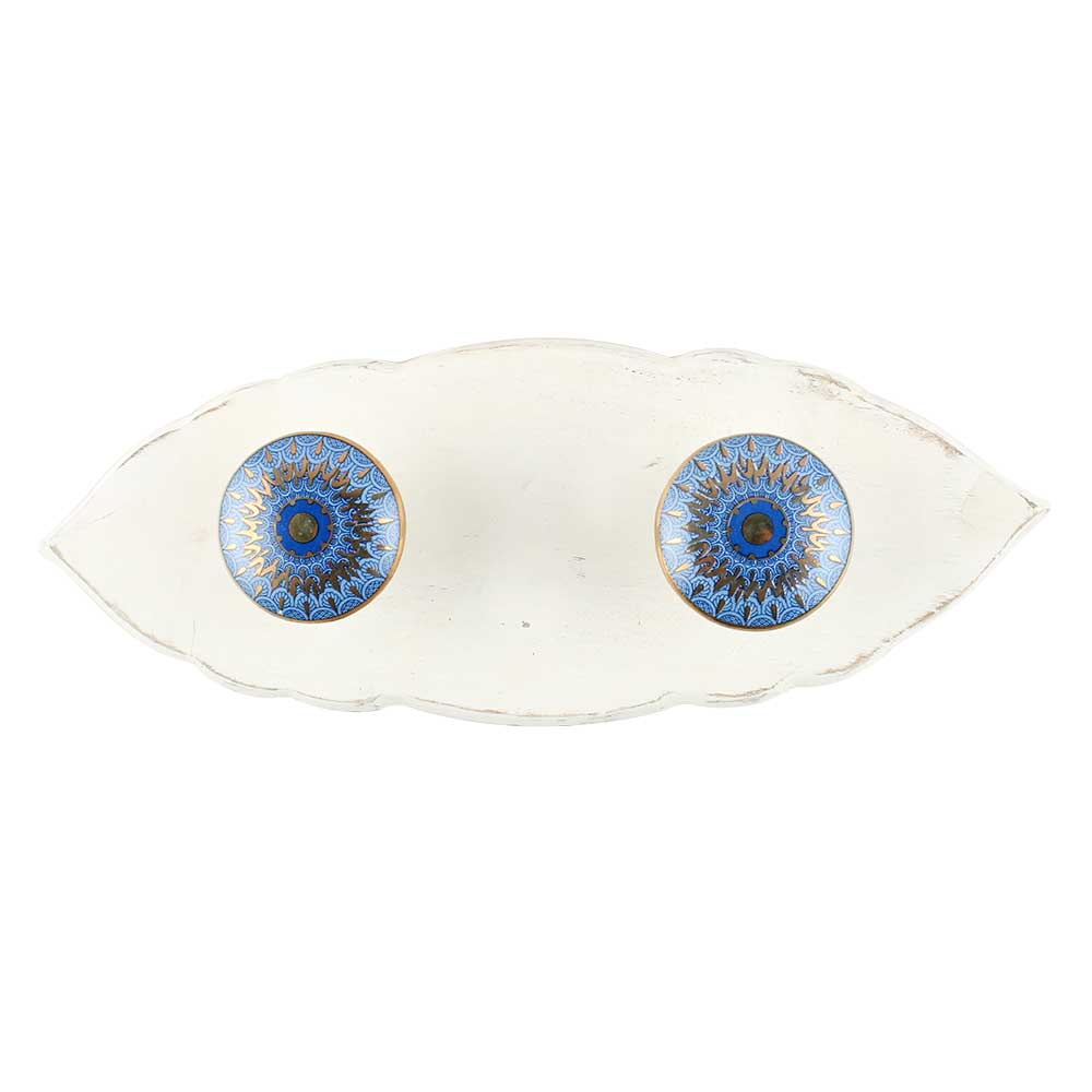 Finish: Glossy white ceramic with intricate blue pattern; smooth, polished wood backing