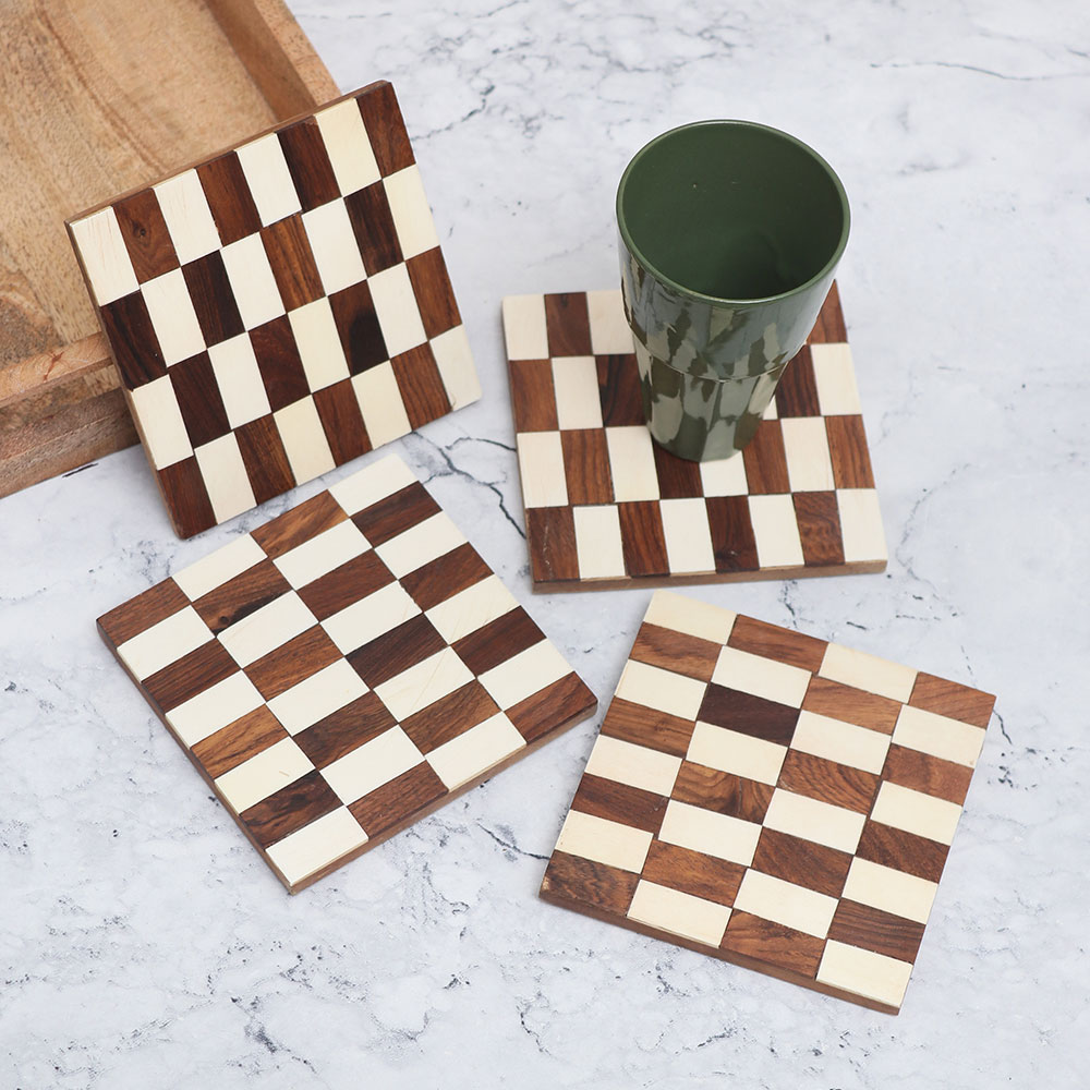 Indianshelf.com for bulk/wholesale orders.Indianshelf.us for personal purchases.Introducing the White and Brown Handcrafted Wooden Coasters – a beautiful combination of natural elegance and practicality. Crafted from high-quality wood with a distinctive white-brown color scheme, these coasters not only protect your furniture from spills and stains but also add an eco-friendly element to your home. Each piece is handcrafted, making it one-of-a-kind and infusing a rustic yet modern charm into any room.