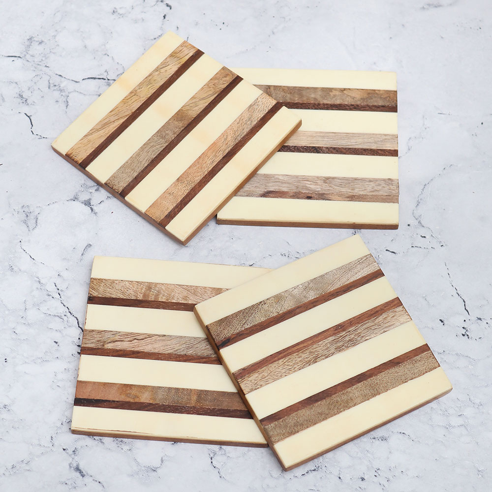 Our exquisite Pack of four wooden coasters is handcrafted with utmost precision and care by skilled Indian artisans. These wooden tea coasters are a true embodiment of elegance and functionality. Made from high-quality wood, each coaster boasts a square shape and features a captivating white and brown coloured pattern, exuding a timeless charm. The artisan\'s meticulous craftsmanship is evident in every detail, creating a coaster set that is not only practical but also serves as a captivating decorative piece for your home or office. The antique finish adds a touch of vintage allure to these coasters, making them a perfect addition to any interior decor style. Designed to hold water, tea, juice, or coffee glasses, these wooden coasters serve as a protective barrier, preventing unsightly stains on your furniture\'s surface. Versatile in nature, they can be utilized in various settings, including homes, offices, restaurants, hotels, or cafes. These best wooden coaster sets are not just practical accessories; they also make for a thoughtful gift for your loved fours on special or festive occasions.