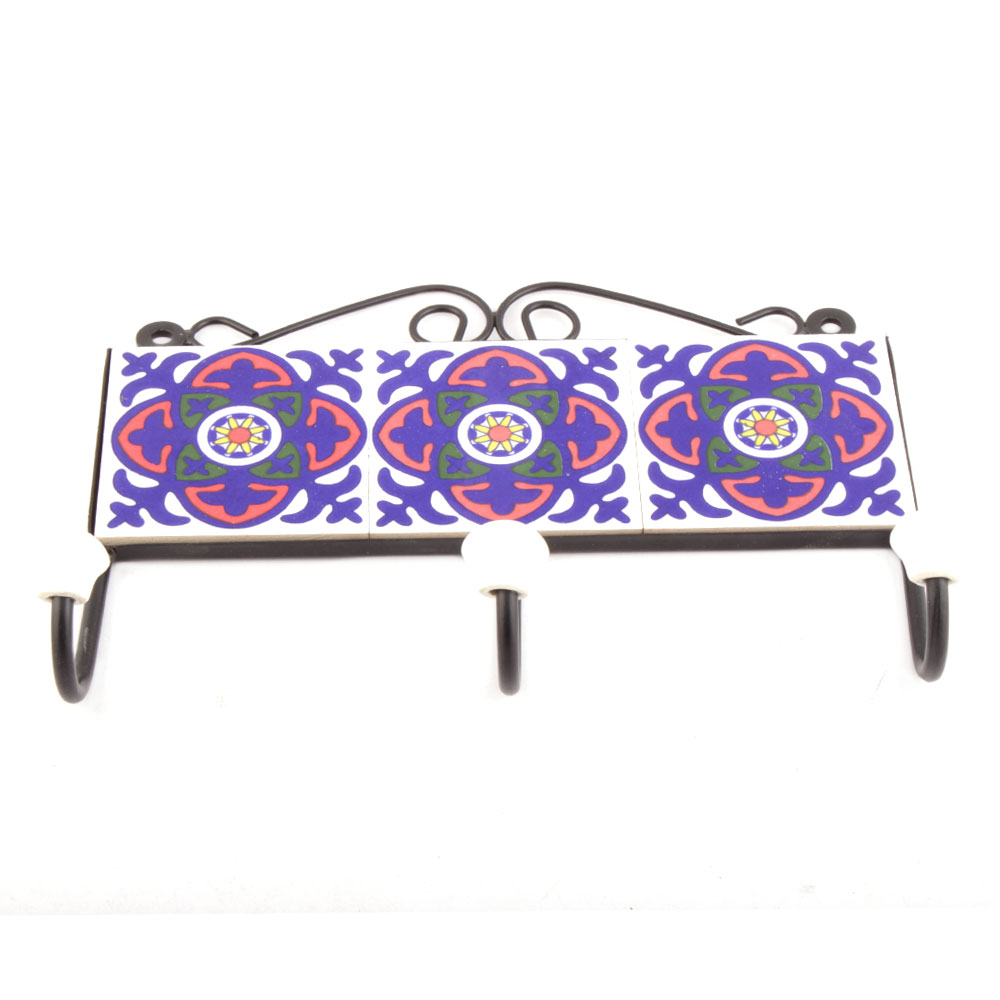 White And Navy Blue Floral Tiles Hooks. When Put on Wall or Cabinet it is an Art in itself. The Metal Part of this Hook is Black Powder Coated.