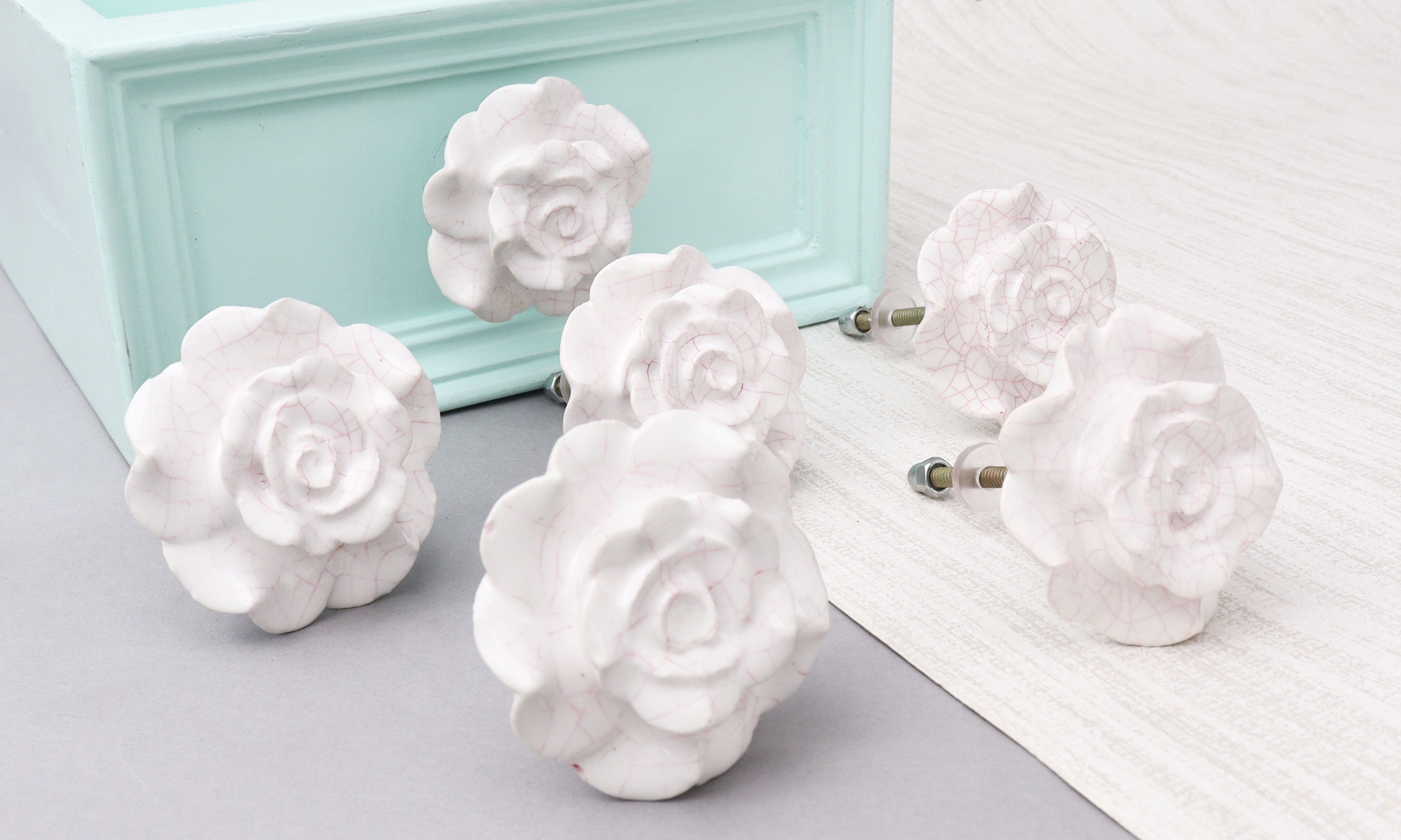 The White and Pink Big Rose Crackle Ceramic Dresser Knobs showcase a beautifully designed rose motif in soft pink and white hues. These knobs are perfect for infusing elegance and charm into your dresser, cabinet, or any furniture piece, enhancing your home décor with their vintage-inspired allure. The crackle ceramic finish provides a unique texture that adds to the overall beauty of the knob, making it a striking addition to any room.