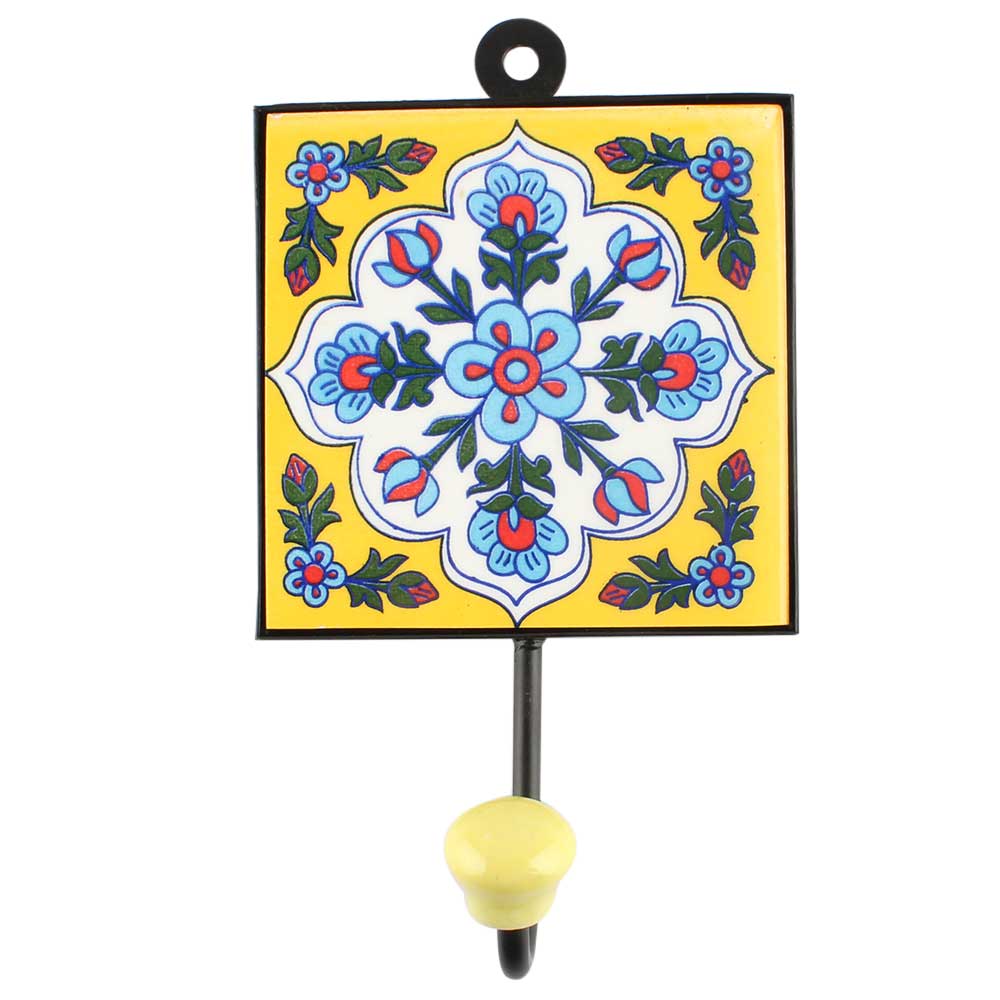 White Base Ceramic Floral Tile Hook. When Put on Wall or Cabinet It is An Art in Itself. The Metal Part of this Hook is Black Powder Coated.
