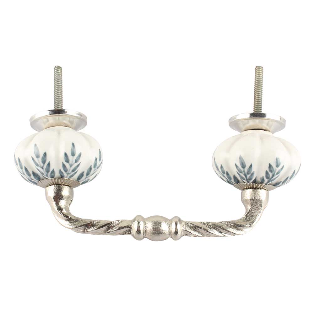 White Base Grey Leaf Ceramic Melon Cut Bridge Handle. Ideal for Drawer, Dresser, Cabinet, Wardrobe, Cupboard and Almirah etc.