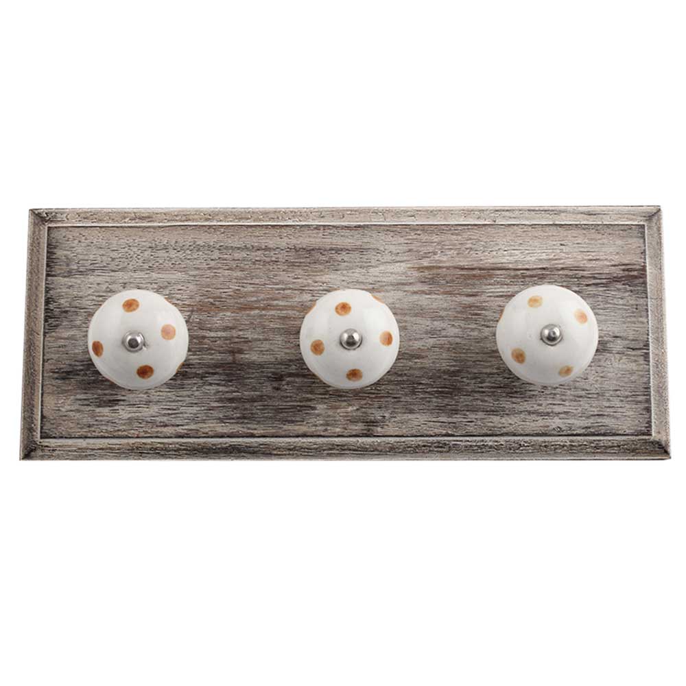 White Brown Dot Wooden Hooks. A Perfect Complement to the Soft Tone of the Wood are these White Traditional Hat Coat Hook Made of Genuine Porcelain and Brass. It can be use to Hang Jewellery, Leashes, Towels, Scarves, Light Weight Sweaters, Caps Etc.