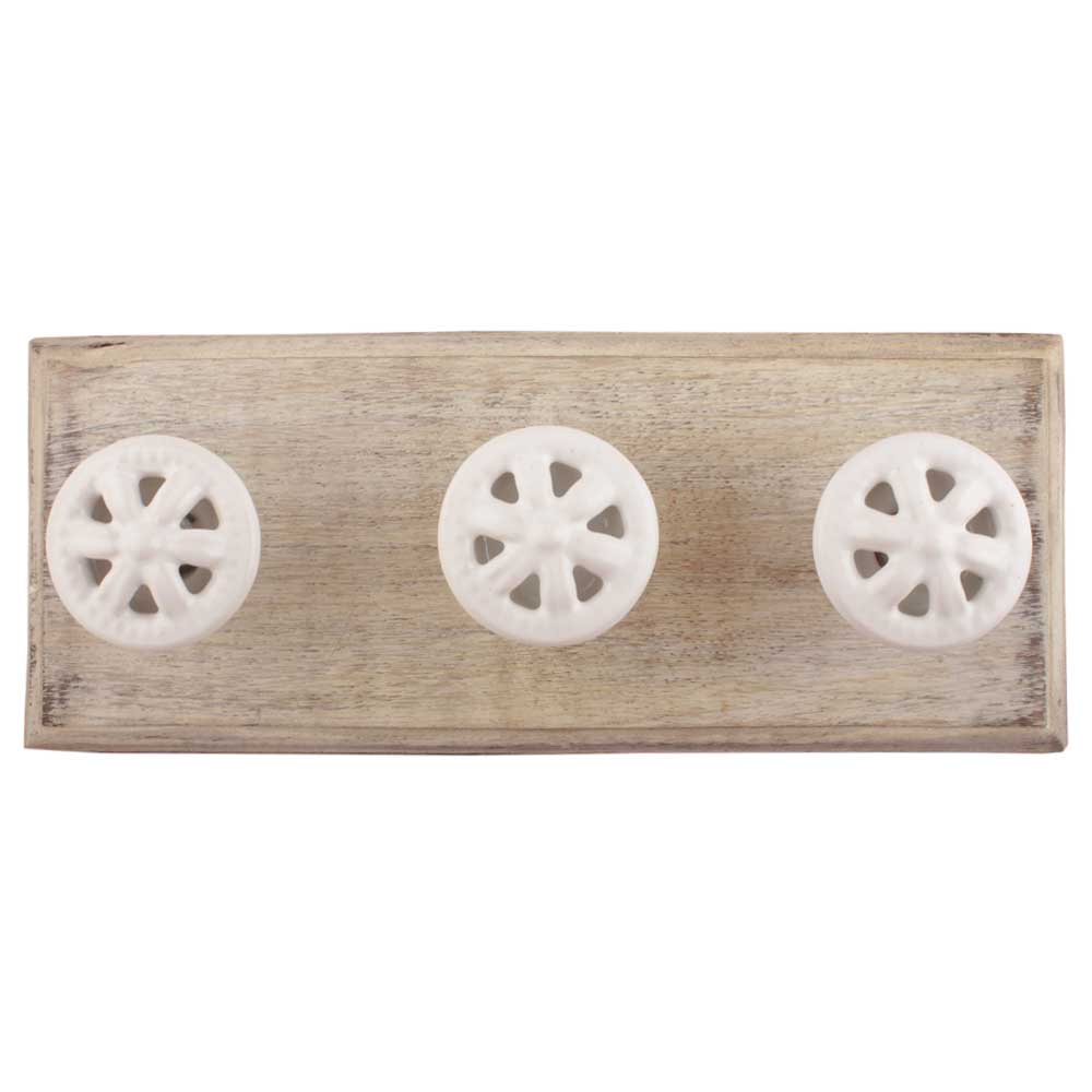 White Flower Ceramic Wooden Hooks. A Perfect Complement to the Soft Tone of the Wood are these White Traditional Hat and Coat Hook Made of Genuine Porcelain and Brass. It can be used to Hang Jewelry, Leashes, Towels, Scarves, Light Weight Sweaters, Caps etc.
