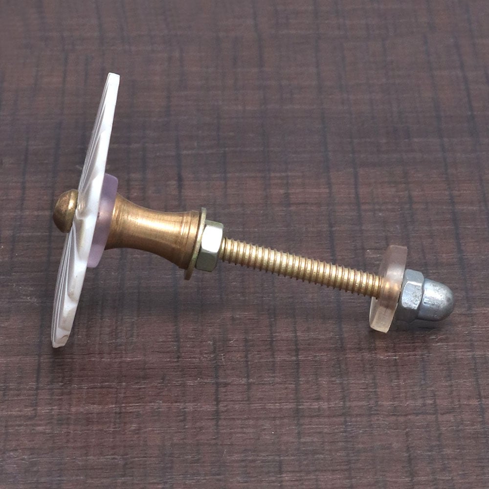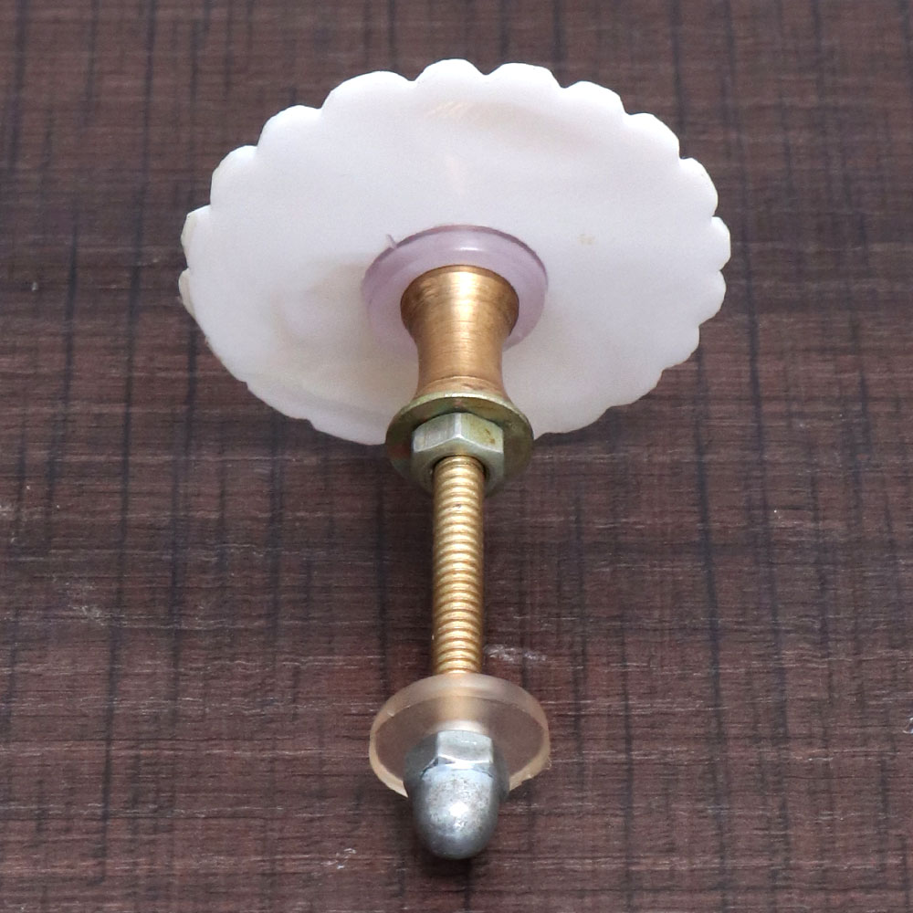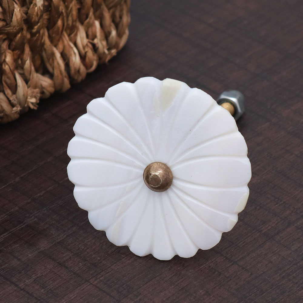 Enhance the aesthetics of your living spaces with our exquisite White Flower-Shaped Mother of Pearl Cabinet Knob that is meticulously crafted by skilled Indian artisans. This elegant and timeless cabinet pull showcases the delicate beauty of mother of pearl, known for its lustrous iridescence and unique patterns, making each knob a work of art in its own right. Ideal for drawers, dressers, cabinets, wardrobes, cupboards, and almirahs, these white cabinet handles add a touch of sophistication to any interior. Whether you're enhancing your home, office, restaurant, hotel, cafe, or shop, these Cabinet Knobs serve as both functional and decorative elements, instantly transforming your furniture into statement pieces. These handcrafted gems are not only a tasteful addition to your decor but also make for thoughtful gifts on special or festive occasions. Show your loved ones you care by presenting them with these exquisite, versatile, and enduring White Flower-Shaped Mother of Pearl Cabinet Knobs.