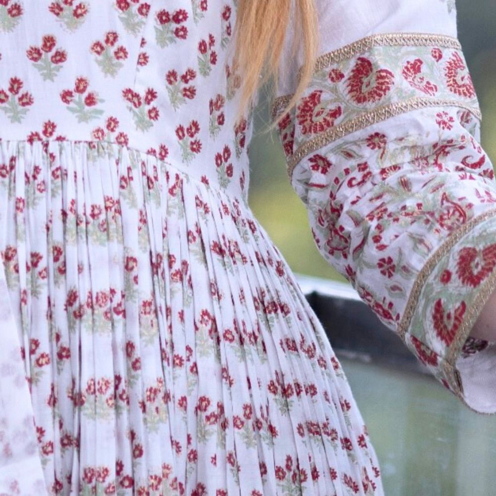 Embrace serene elegance with this White Gathered Anarkali Set, crafted in airy muslin fabric and adorned with exquisite hand block prints. Featuring delicate floral patterns in shades of red and earthy tones, the Anarkali showcases a flattering round neckline, three-quarter sleeves, and a voluminous flare that flows beautifully with every step. Paired with a comfortable cotton bottom in a soft white hue, this ensemble offers a graceful and breathable fit—ideal for festive mornings, intimate celebrations, or daytime rituals. The look is completed with a sheer viscose organza dupatta, delicately bordered with hand-printed detailing for a subtle yet refined finish. This handcrafted suit set perfectly captures traditional Indian artistry while offering a modern, lightweight silhouette suited for contemporary women. Whether you're attending a puja or a summer gathering, this white Anarkali set ensures effortless sophistication and timeless charm in every wear.