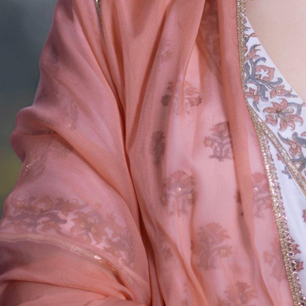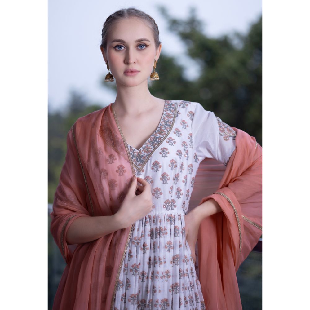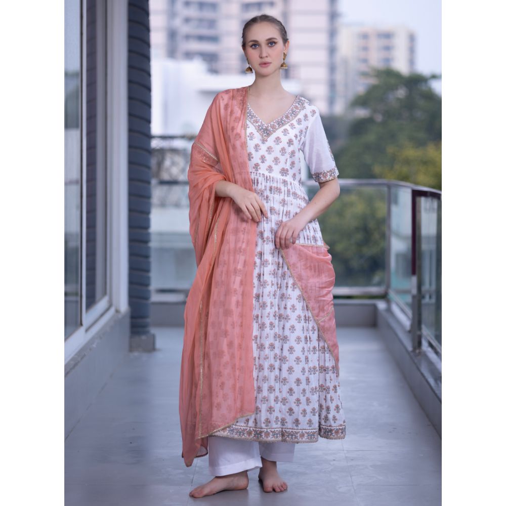 Embrace understated elegance with this White Gathered Anarkali Set, a beautiful blend of grace, comfort, and heritage craftsmanship. Made from pure cotton Chanderi fabric, the Anarkali is adorned with delicate hand block prints and intricate hand embroidery that accentuate its timeless appeal. The gathered flare and V-neckline enhance the feminine silhouette, while the short sleeves add a touch of classic sophistication. Paired with a breathable cotton bottom for all-day comfort, this ensemble is perfect for festive brunches, summer celebrations, or daytime wedding events. The set is elevated with a soft viscose organza dupatta in a subtle peach hue, finished with embroidered detailing for added refinement. This handcrafted white Anarkali set reflects traditional Indian artistry with a modern aesthetic — ideal for women who prefer minimal elegance with a cultural soul. Pair with juttis and chandbalis to complete your effortlessly chic ethnic look.