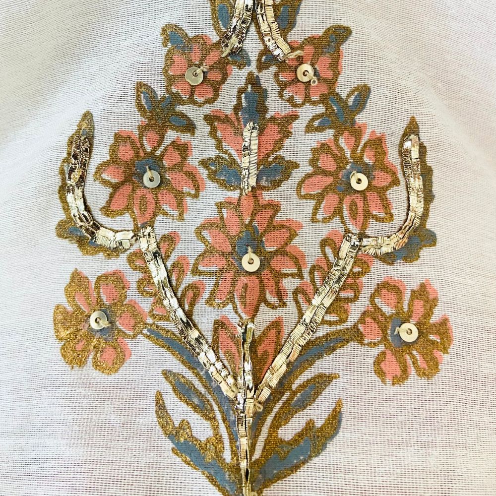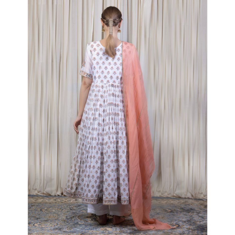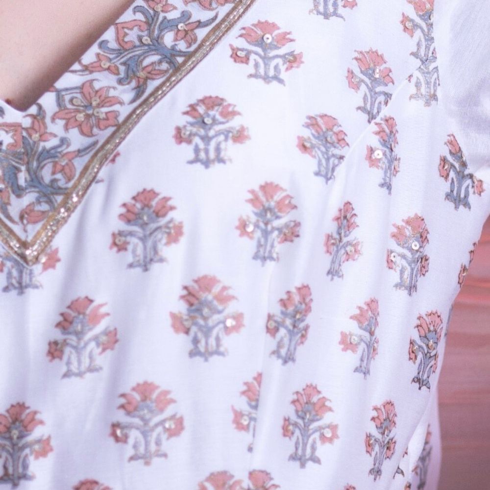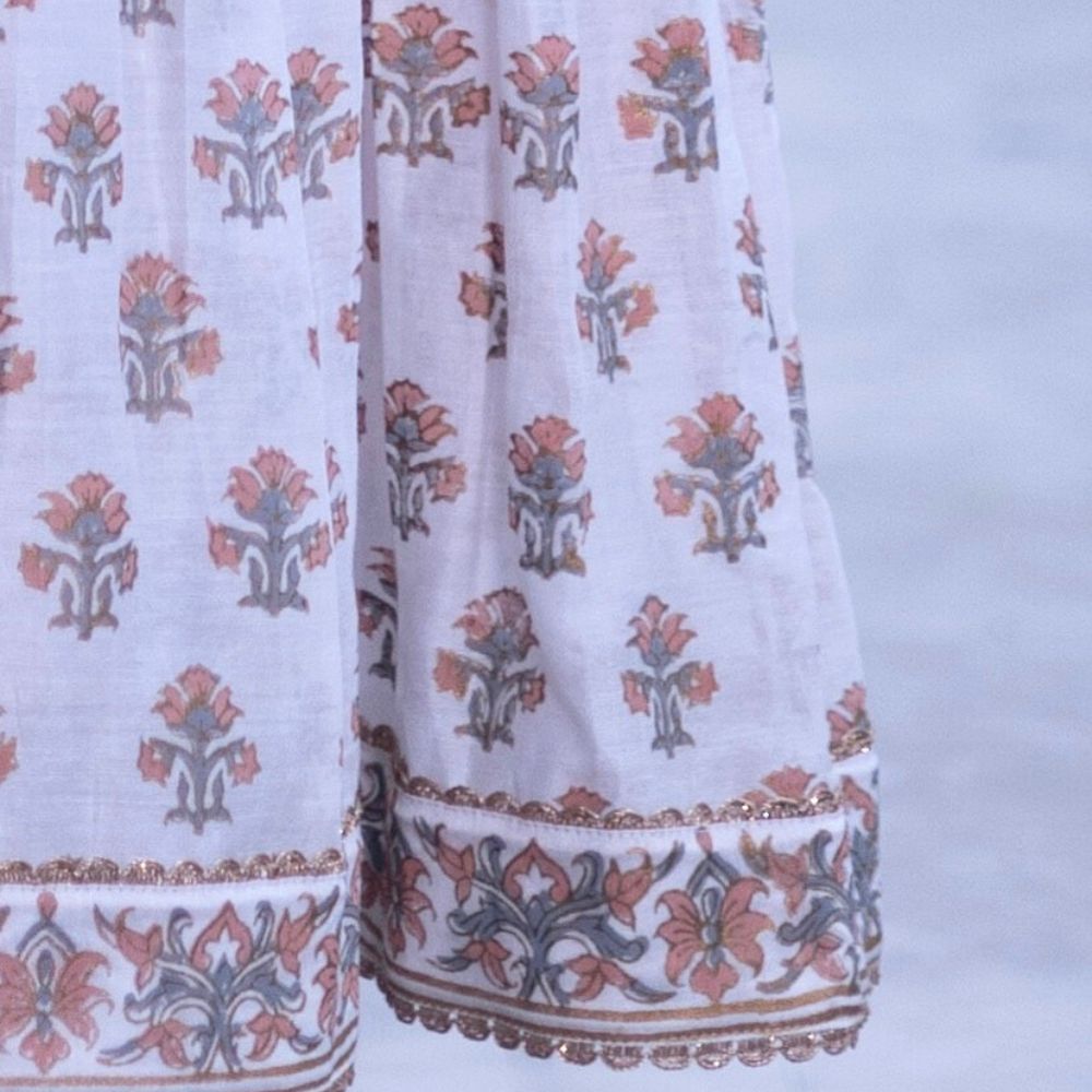 Embrace understated elegance with this White Gathered Anarkali Set, a beautiful blend of grace, comfort, and heritage craftsmanship. Made from pure cotton Chanderi fabric, the Anarkali is adorned with delicate hand block prints and intricate hand embroidery that accentuate its timeless appeal. The gathered flare and V-neckline enhance the feminine silhouette, while the short sleeves add a touch of classic sophistication. Paired with a breathable cotton bottom for all-day comfort, this ensemble is perfect for festive brunches, summer celebrations, or daytime wedding events. The set is elevated with a soft viscose organza dupatta in a subtle peach hue, finished with embroidered detailing for added refinement. This handcrafted white Anarkali set reflects traditional Indian artistry with a modern aesthetic — ideal for women who prefer minimal elegance with a cultural soul. Pair with juttis and chandbalis to complete your effortlessly chic ethnic look.