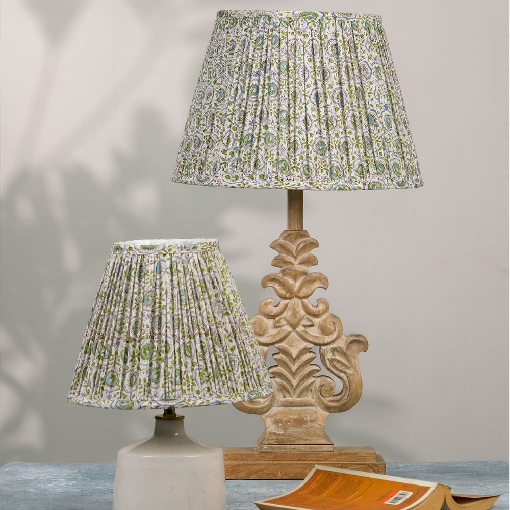 Get your space summer ready with breezy white and green floral motifs with cotton block print empire pleated lampshade. Available in 3 sizes.