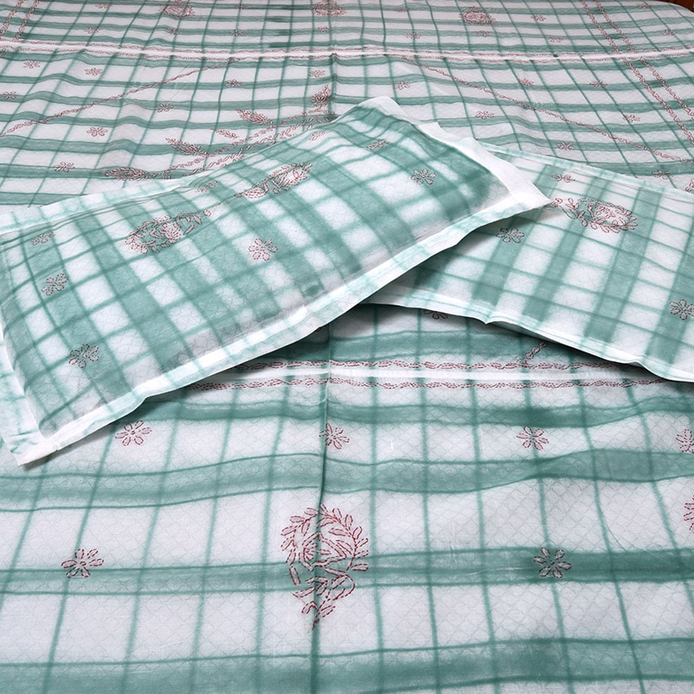 White- green cotton checkered double bed with pink chikankari design. Hand crafted supporting eye capturing designs and colours.