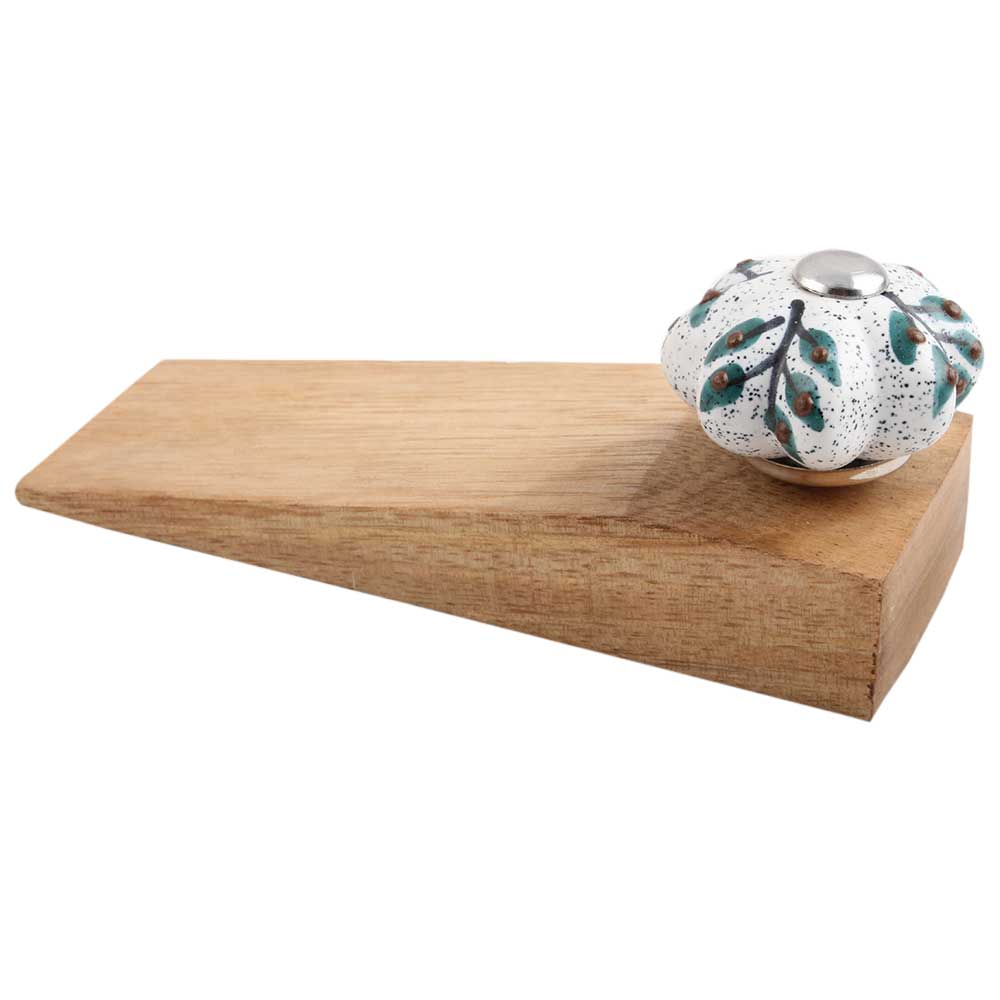 Indianshelf.com for bulk/wholesale orders.Indianshelf.us for personal purchases.Introducing the White Green Leaf Melon Ceramic Wooden Door Stopper — a stylish and practical home accessory that enhances any room. The beautifully designed ceramic features delicate green leaves set against a soft white background, complemented by a sturdy wooden base. Perfect for protecting your doors and walls, this door stopper also adds a touch of nature-inspired beauty to your home décor.