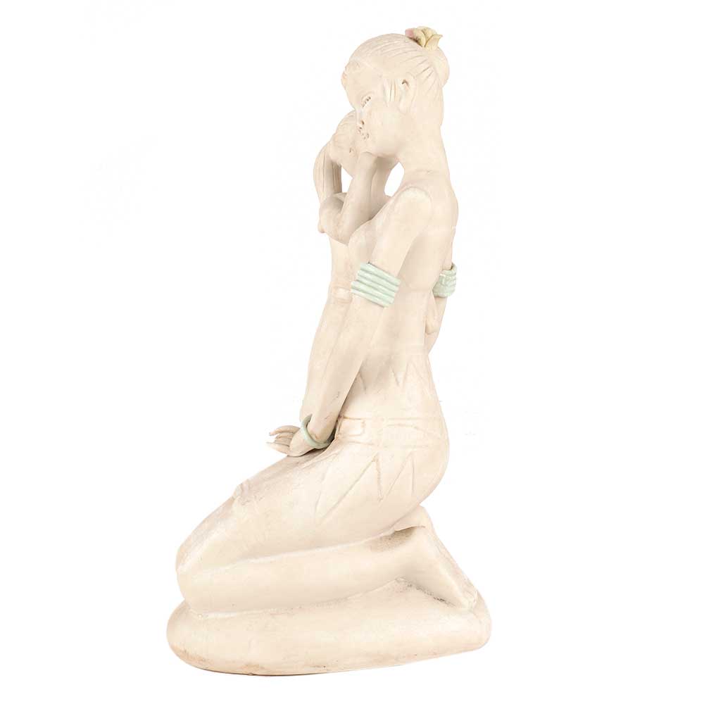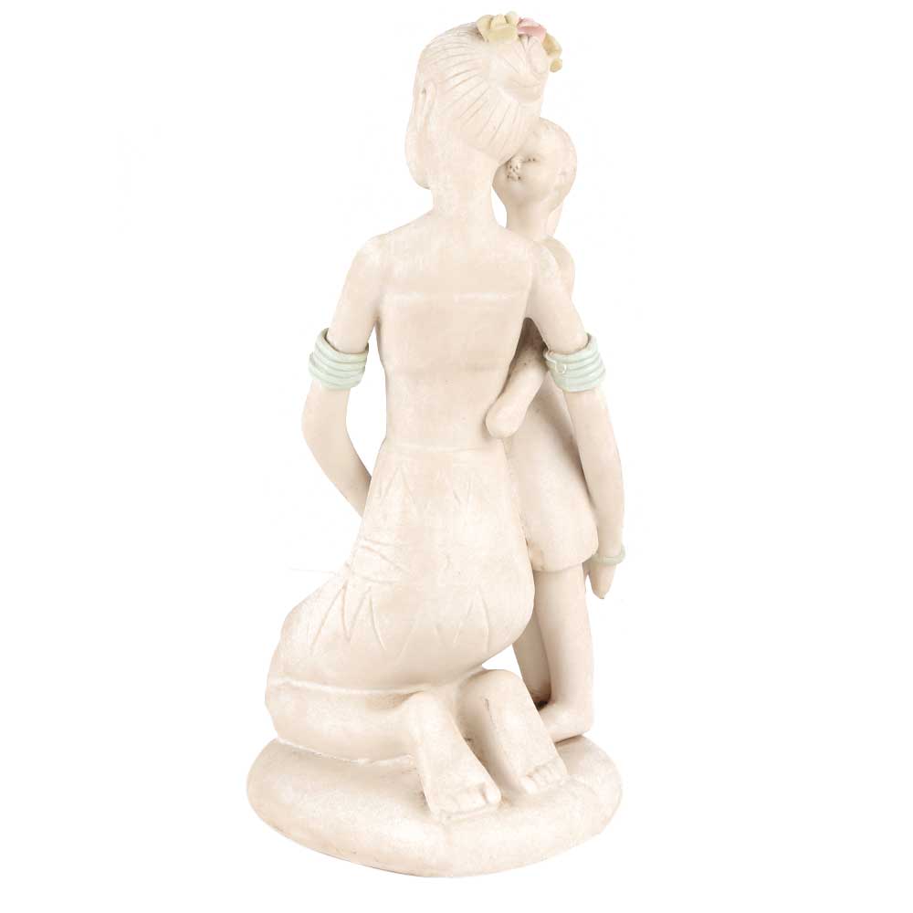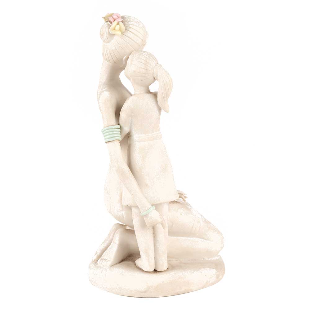 This is a handmade porcelain figurine of a young mother and a girl in a cream dress whispering something in her ear. This is the perfect gift to recognize the wonderful bonds that form between parent and kid, grandparent and children. This figurine is displayable on a desk, tabletop, or fireplace.