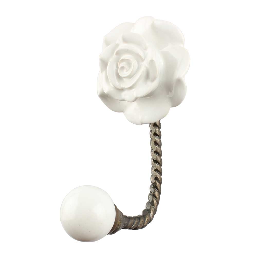 The antique finish of the fitting adds a subtle, vintage flair, creating a look that feels both nostalgic and elegant. The combination of the white ceramic rose and the antique hardware makes this wall hook a timeless addition to any home. The subtle patina on the fitting contrasts beautifully with the fresh, crisp white of the rose, giving the piece a charming and distinguished appearance.