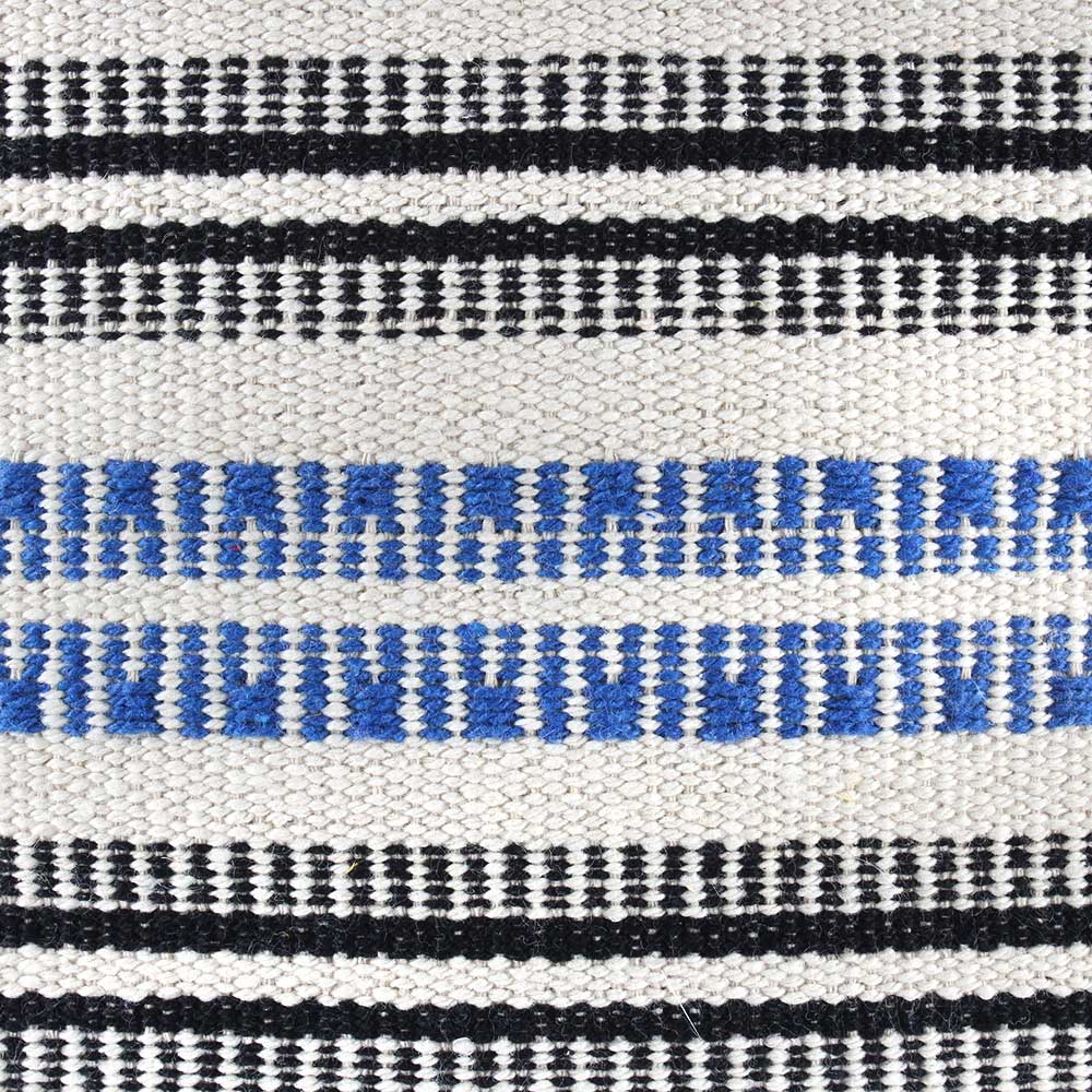 Blue Bohemian Pillow features a beautiful denim blue chenille pattern woven into a rich textured broad weave fabric. This hand-loomed pillow, embellished with a silky fringe, combines the finest of imaginative Boho design with contemporary flair.