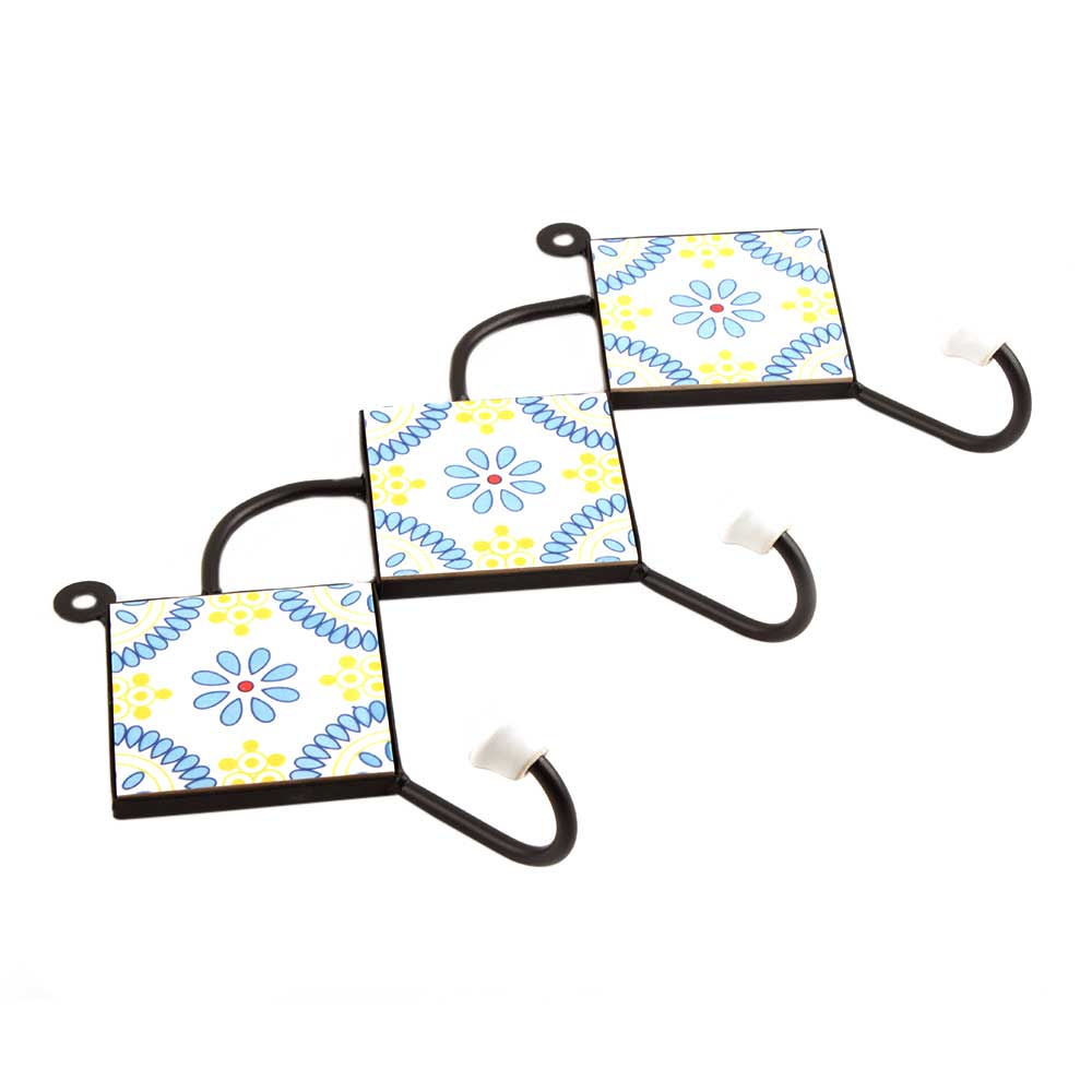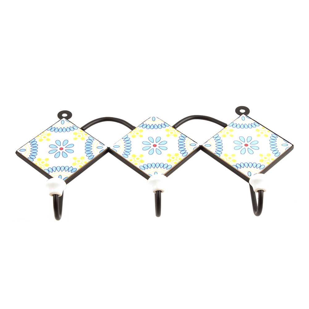 White Turquoise Yellow Floral Tiles Hook. When Put on Wall or Cabinet It is An Art in Itself. the Metal Part of This Hook is Black Powder Coated.