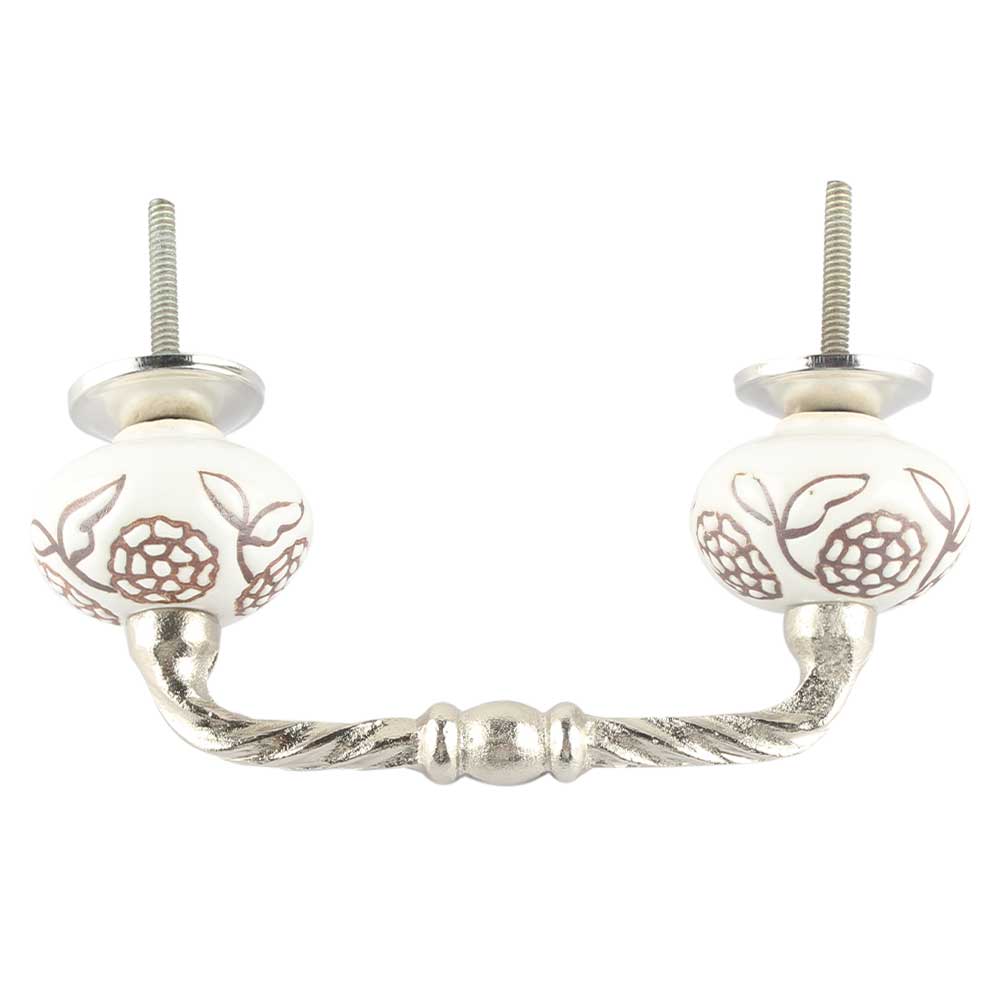 Indianshelf.com for bulk/wholesale orders.Indianshelf.us for personal purchases.The White With Brown Marigold Etched Ceramic Cut Bridge Handle combines the elegance of ceramic craftsmanship with intricate design details. This handle features a classic white base adorned with a beautiful brown marigold etched pattern, creating a timeless and sophisticated look. Ideal for cabinets, drawers, or doors, it adds a touch of vintage charm and contemporary style to any space. Perfect for those looking to enhance their home’s decor with an artistic and functional piece.