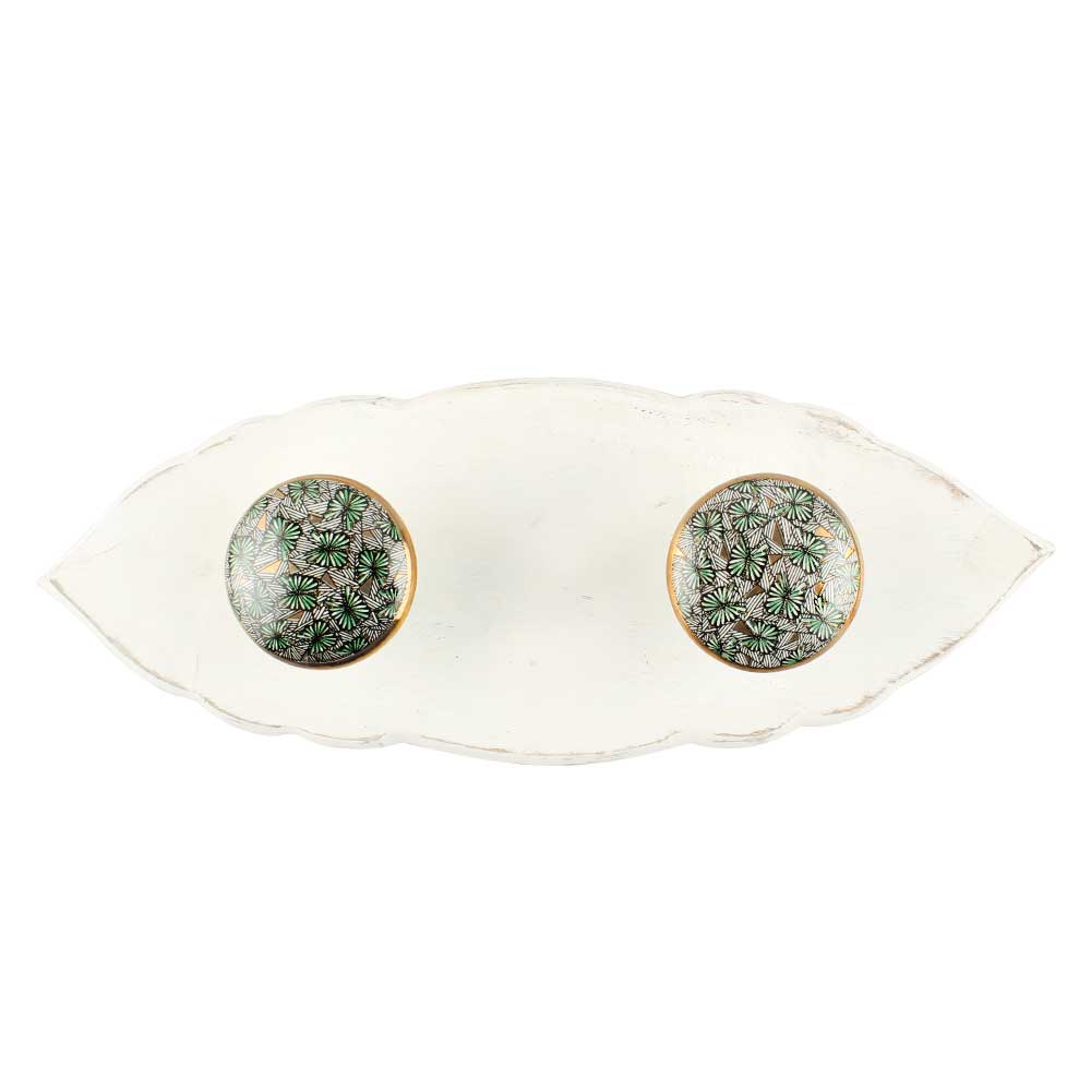 Finish: Glossy white ceramic with hand-painted green butterflies; smooth natural wood finish