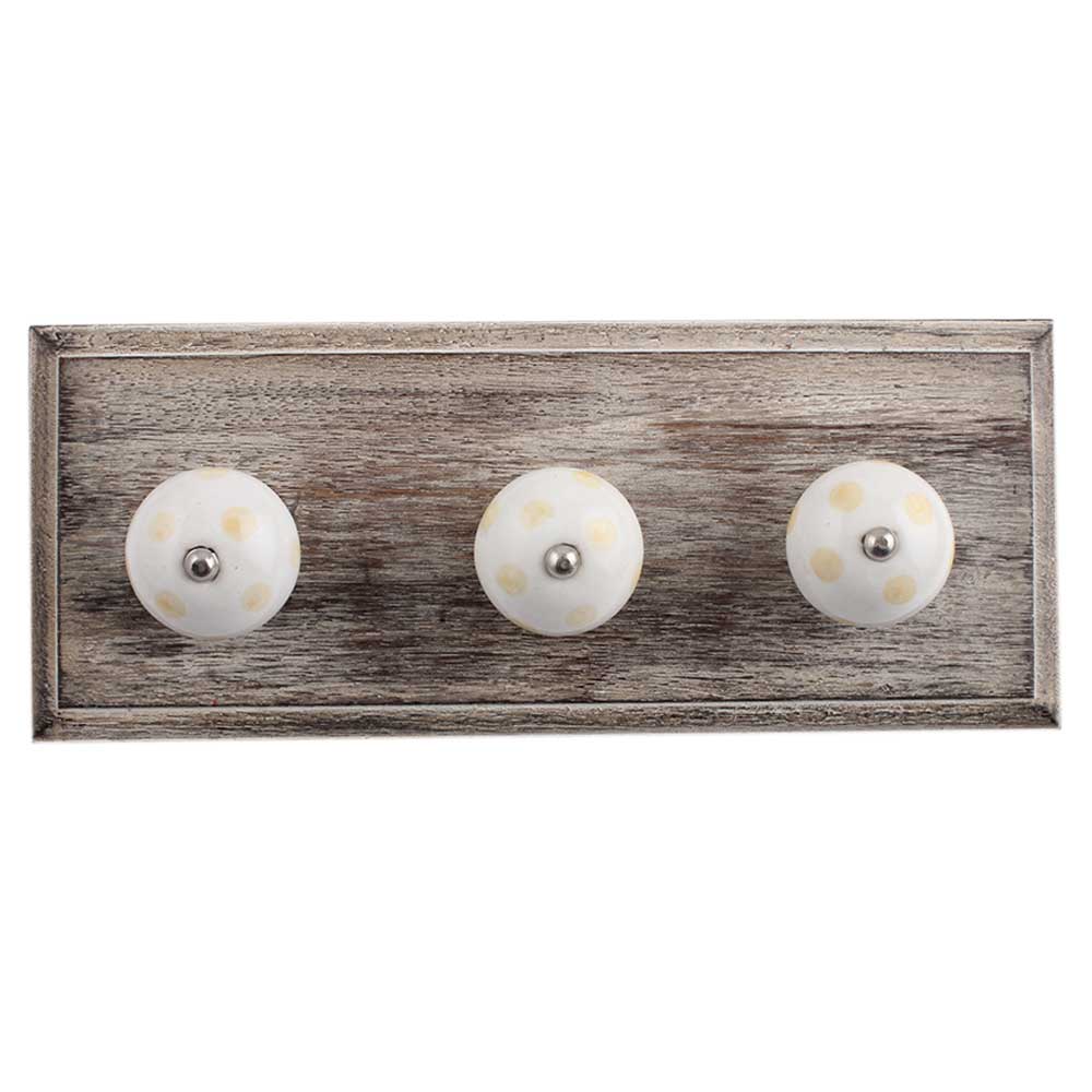 White Yellow Dot Wooden Hooks. A Perfect Complement to the Soft Tone of the Wood are these White Traditional Hat Coat Hook Made of Genuine Porcelain and Brass. It can be use to Hang Jewellery, Leashes, Towels, Scarves, Light Weight Sweaters, Caps Etc.