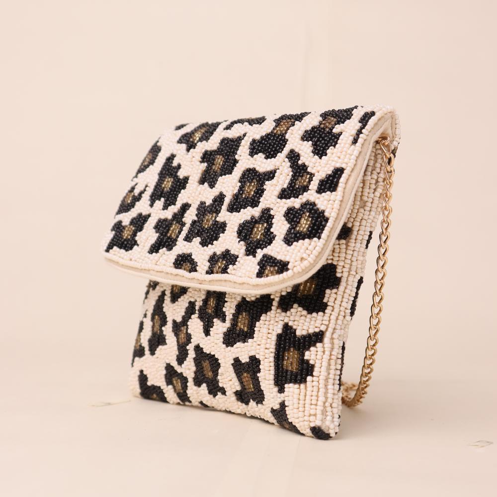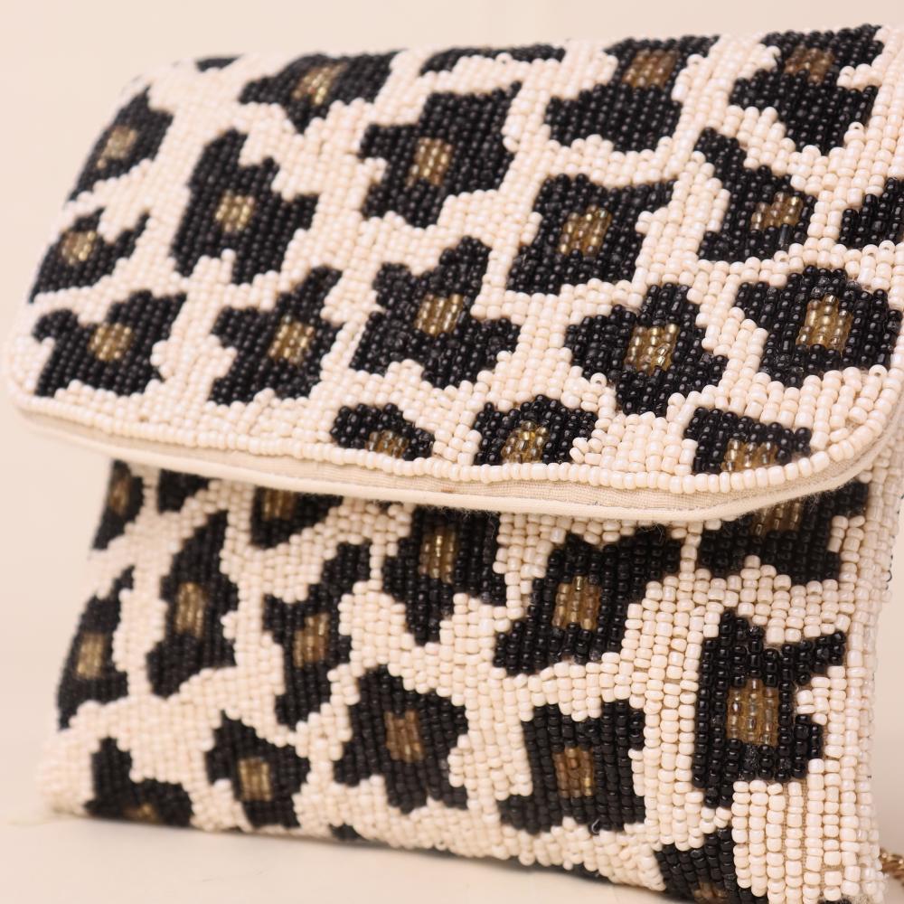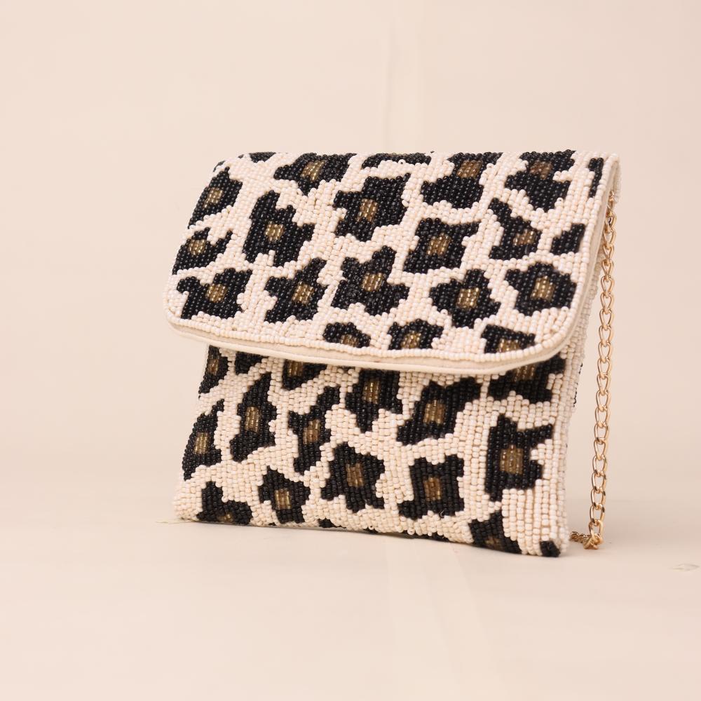 Turn heads with the fierce sophistication of the Wild Luxe Clutch — a hand-beaded masterpiece featuring a bold leopard print in rich ivory, black, and golden tones. Meticulously crafted for fashion-forward statements, this clutch brings texture, glamour, and wild elegance to your evening or daywear look. Finished with a detachable gold-tone chain strap, it effortlessly transitions from a sleek handheld clutch to a chic shoulder bag.