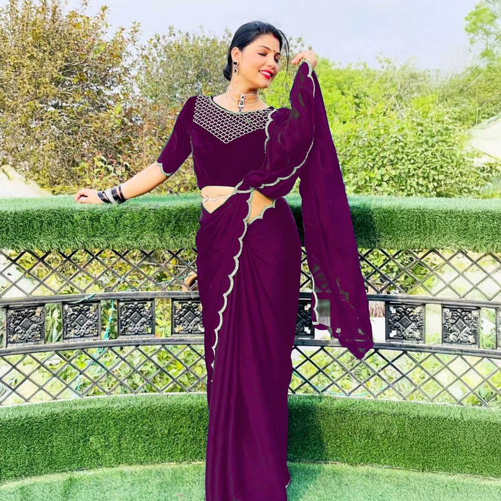 Exude timeless charm in this Bollywood-style wine crepe georgette saree, designed to make you feel nothing short of a star. Crafted from fluid, lightweight georgette, this saree offers an elegant fall and seamless drape that flatters every silhouette. The rich wine shade adds a regal flair, while the silver scalloped lace border lends a touch of shimmer and sophistication. Perfect for cocktail nights, wedding receptions, or festive events, this saree balances subtle glamor with refined elegance. Pair it with a statement blouse, bold jewelry, and heels to complete your red-carpet-ready ensemble. Whether you're dancing the night away or making a grand entrance, this saree promises both comfort and class in every pleat.