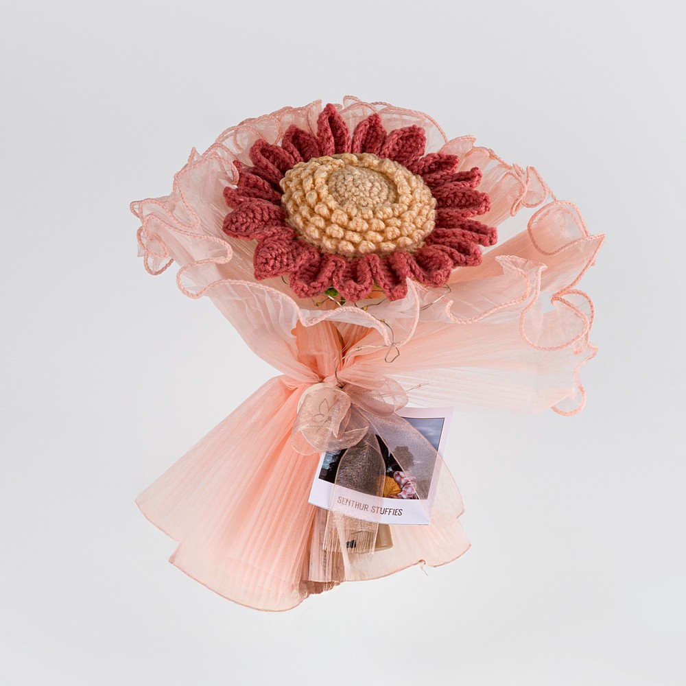 Wine Red Crochet Sunflower Wrapped In Peach Tulle