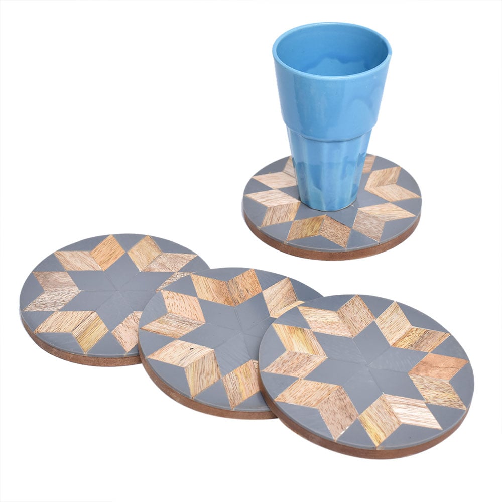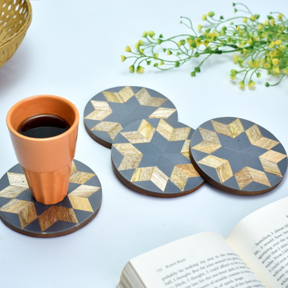 With these cool, dimensional, abstract wooden drink coasters, your morning cup of tea or coffee will feel extra special. They will complement any kitchen area, bar, coffee table, or desk. They are also appropriate for weddings, anniversaries, and housewarmings! Indian artisans meticulously design, hand-cut, and wrap each set of coasters to ensure that our customers receive the highest quality product possible.