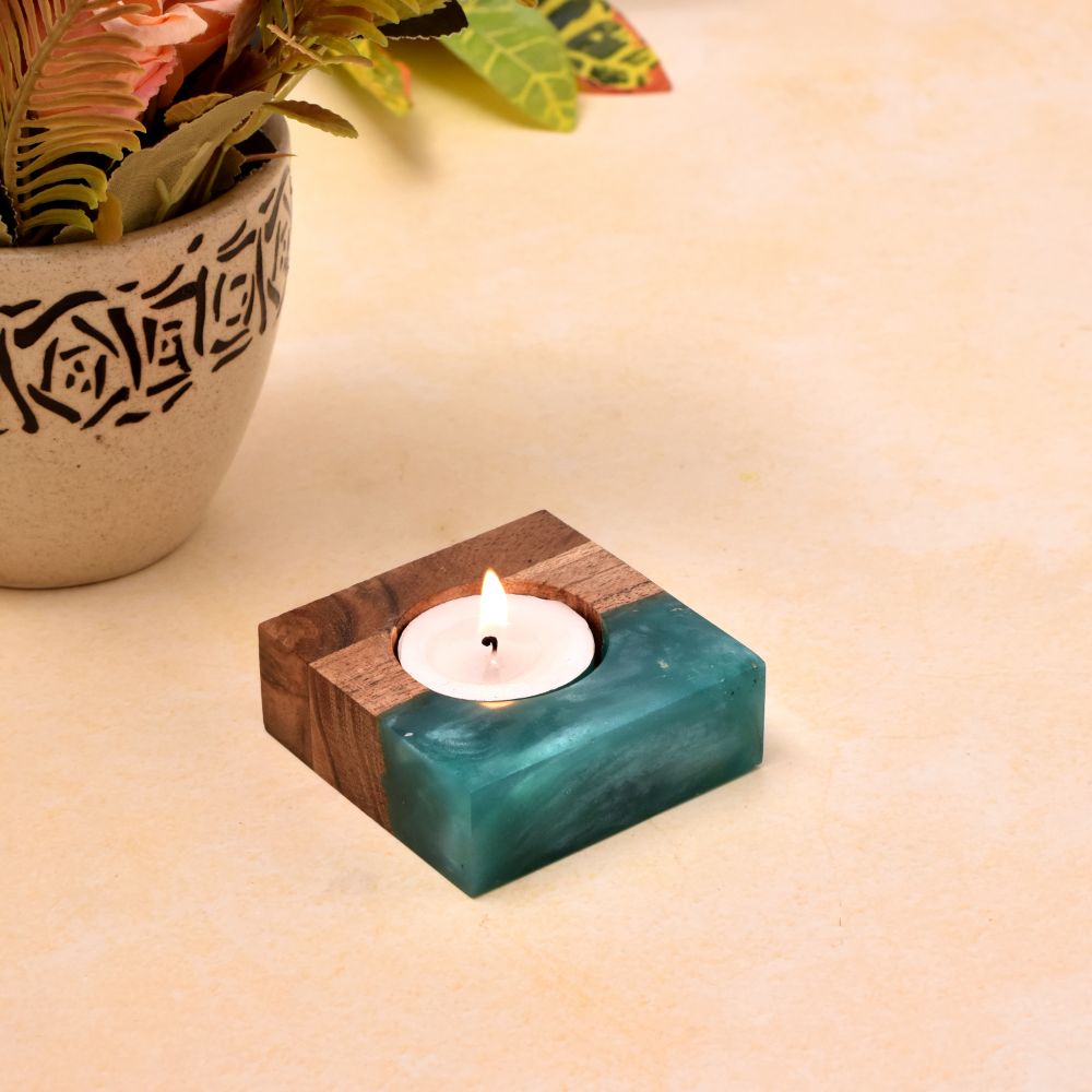 A wood tea-light holder with a translucent aqua resin effect on one side is a beautiful, unique home decor that combines natural elements with modern design. The wood tea-light Holder is typically made from durable and sturdy wood such as teak or oak, and the translucent aqua resin is used to create a stunning visual effect. The pleasing aqua resin effect on one side of the wood tea-light Holder creates a beautiful contrast with the natural wood, adding a touch of sophistication and elegance to any room. The colour aqua is often associated with tranquillity and relaxation, making it a perfect addition to a calming atmosphere. The wood tea-light holder with a translucent aqua resin effect on one side is functional and a beautiful piece of home decor. This Tea-Light Holder, with its aesthetically attractive structure of an island paradise, is a unique decorative item and is a fantastic décor to greet festivals and host guests. It can be used as a centrepiece or accent piece, adding warmth and charm to any space. It is also a great gift item for any occasion, such as weddings, birthdays, or housewarming ceremonies.