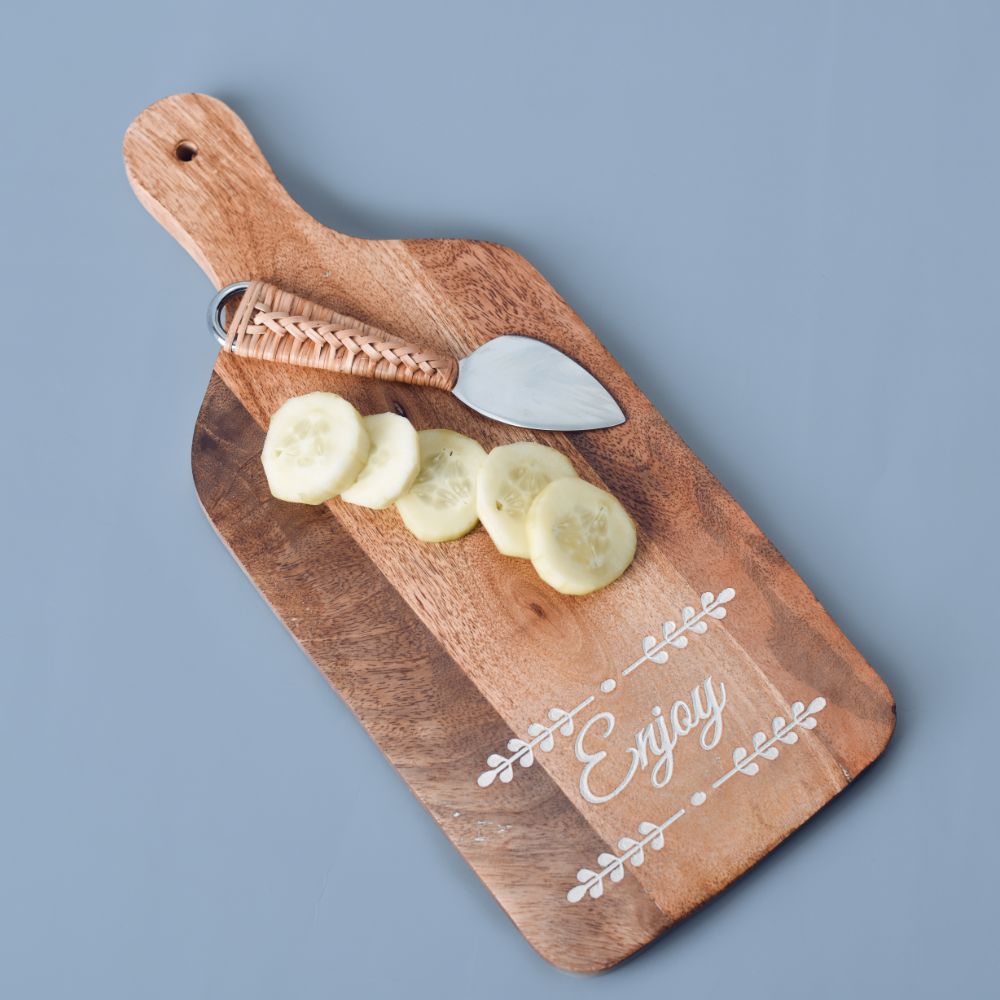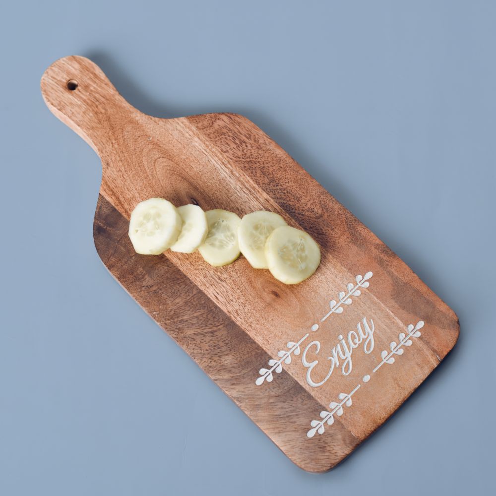 The chopping board is a common object in modern kitchens, and it is frequently constructed of plastic or silicone. Our preference, however, is for long-lasting and aesthetically pleasing butcher block cutting boards. Cutting boards are no longer merely for cutting; they may also be used to decorate the kitchen. This multi-purpose wood cutting board with handle is ideal for serving cheese, sausages, and canapés. The serving board is ideal for slicing bread and sausages before making a tasty sandwich. Our charcuterie board set is ideal for entertaining and catering events, while our hardwood serving trays and plates are ideal for use at home or in a restaurant. We provide a large selection of wood kitchen presents, accessories, and decorative things at reasonable pricing.
