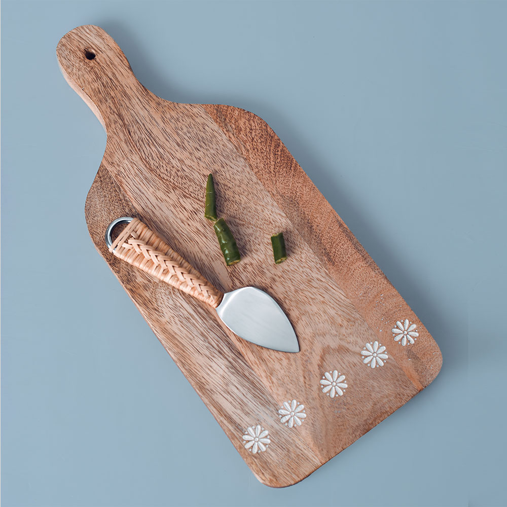 A wooden chopping board with a handle is a versatile kitchen tool perfect for slicing, dicing, and chopping fruits, vegetables, and meats. It is made of high-quality wood, usually, maple, walnut, or cherry, which is durable and resistant to moisture and bacteria. The handle is an essential feature of this type of chopping board, making it easy to carry it from one place to another. The handle is typically made of the same wood as the board and is designed to fit comfortably in hand. The surface of the chopping board is smooth and flat, making it easy to slice and chop ingredients without damaging the blade of the knife. Wooden boards are also gentle on the edge, preventing them from becoming dull quickly. A wooden chopping board with a handle is also an attractive addition to any kitchen. The natural wood grain gives the space a unique look that adds warmth and character. It is also easy to maintain by washing it with warm soapy water and drying it thoroughly after each use. Overall, a wooden chopping board with a handle is a must-have kitchen tool for anyone who enjoys cooking and wants to make food preparation more manageable and enjoyable.