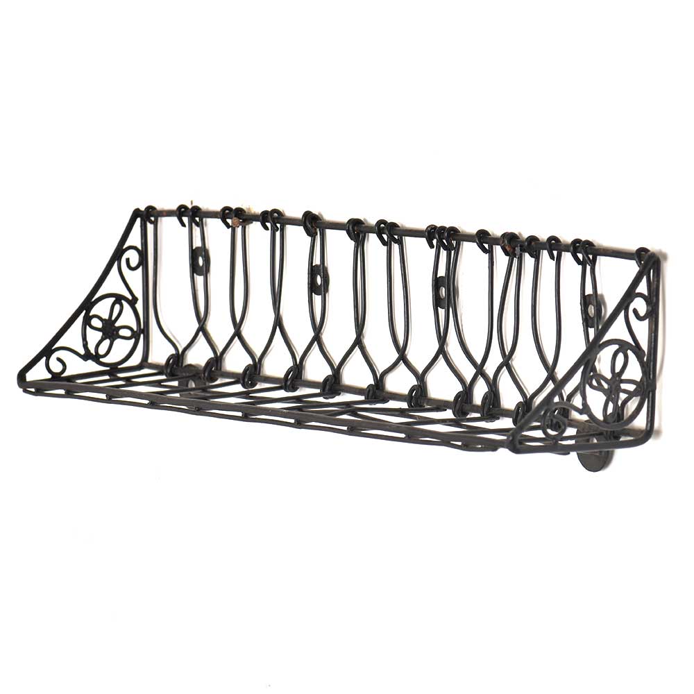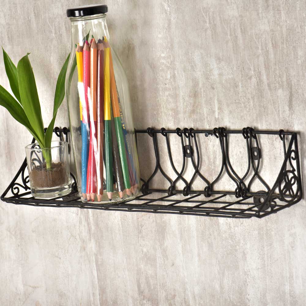 The Wrought Iron wall shelf can be used for planters outside your home or in the interiors of your home. Decorate any room in your house with this charming wrought iron wall shelf. Especially suited for a bathroom, study, or entryway The wall mounted shelf does not include the things used for display during photoshoot.