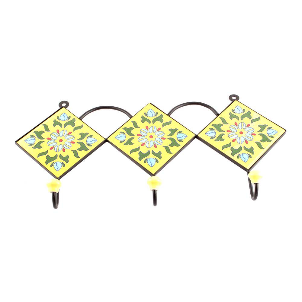 Yellow And Forest Green Leaf Ceramic Floral Tiles Hooks. When Put on Wall or Cabinet it is an Art in itself. The Metal Part of this Hook is Black Powder Coated.