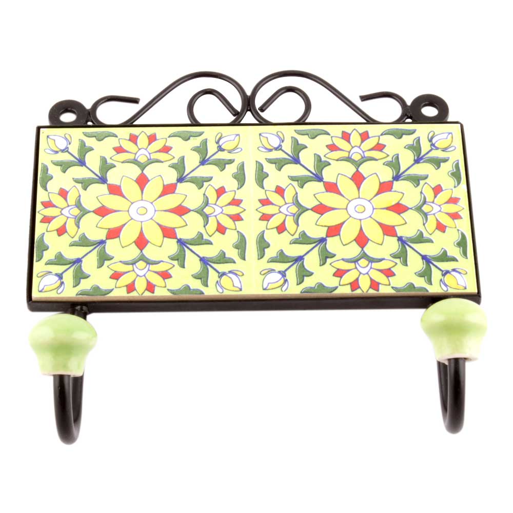 Yellow And Forest Green Leaf Ceramic Floral Tiles Hooks. When Put on Wall or Cabinet it is an Art in itself. The Metal Part of this Hook is Black Powder Coated.