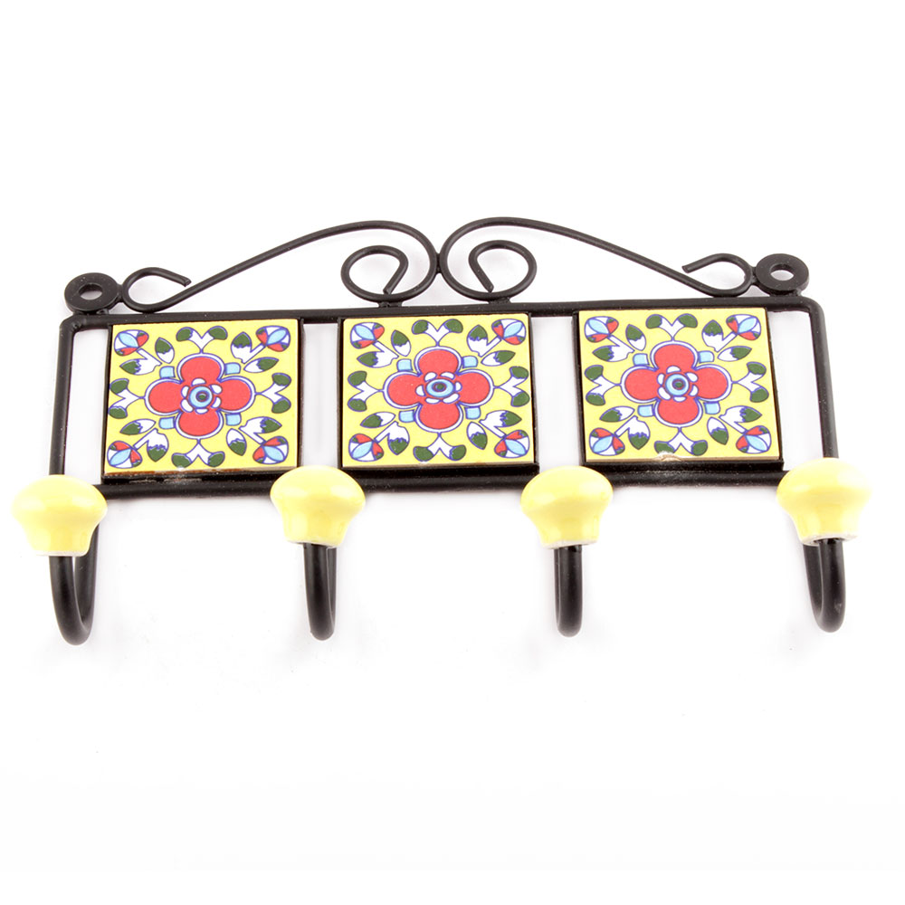 Yellow And Red Floral Tiles Hooks. When Put on Wall or Cabinet it is an Art in itself. The Metal Part of this Hook is Black Powder Coated.