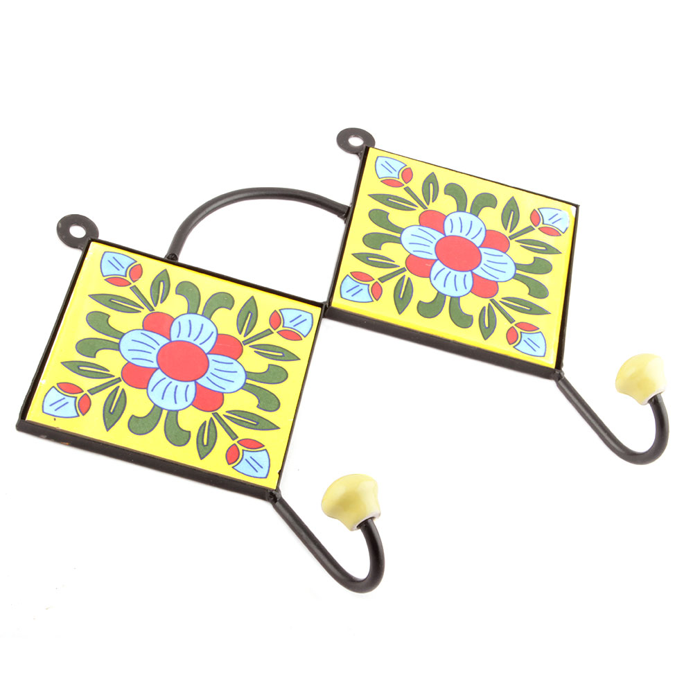 Yellow And Turquoise Ceramic Floral Tiles Hooks. When Put on Wall or Cabinet it is an Art in itself. The Metal Part of this Hook is Black Powder Coated.