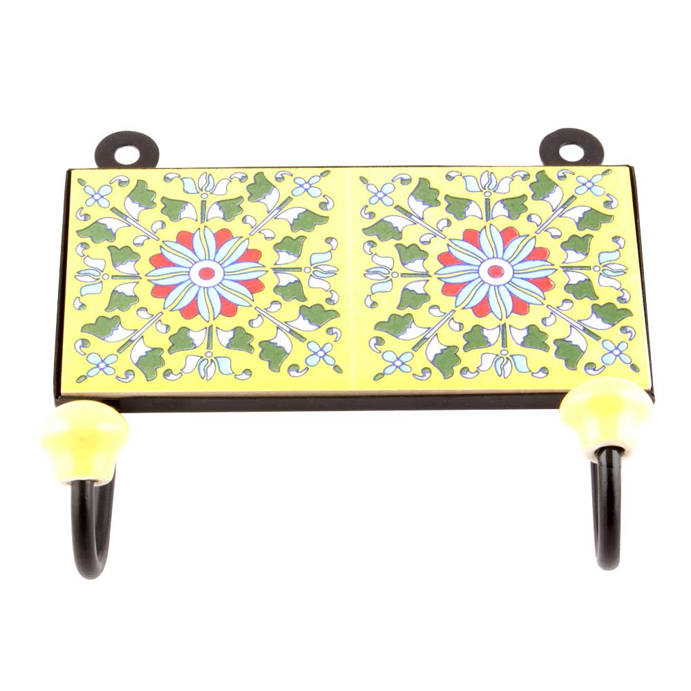 Yellow And Turquoise Ceramic Floral Tiles Hooks. When Put on Wall or Cabinet it is an Art in itself. The Metal Part of this Hook is Black Powder Coated.