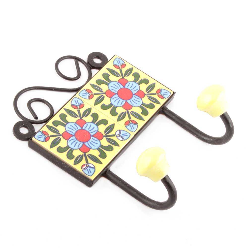 Yellow And Turquoise Floral Tiles Hooks Online. When Put on Wall or Cabinet it is an Art in itself. The Metal Part of this Hook is Black Powder Coated.
