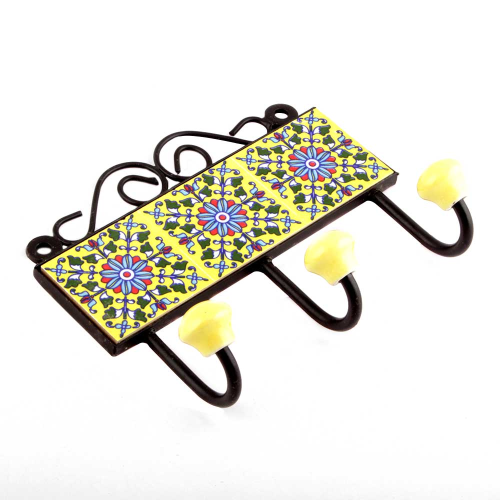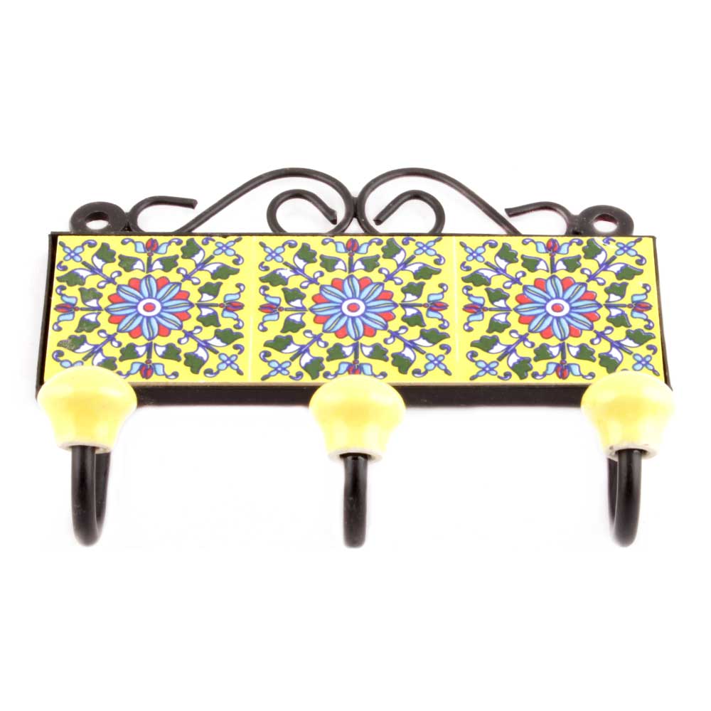 Yellow And Turquoise Sunflower Tiles Hooks. When Put on Wall or Cabinet it is an Art in itself. The Metal Part of this Hook is Black Powder Coated.