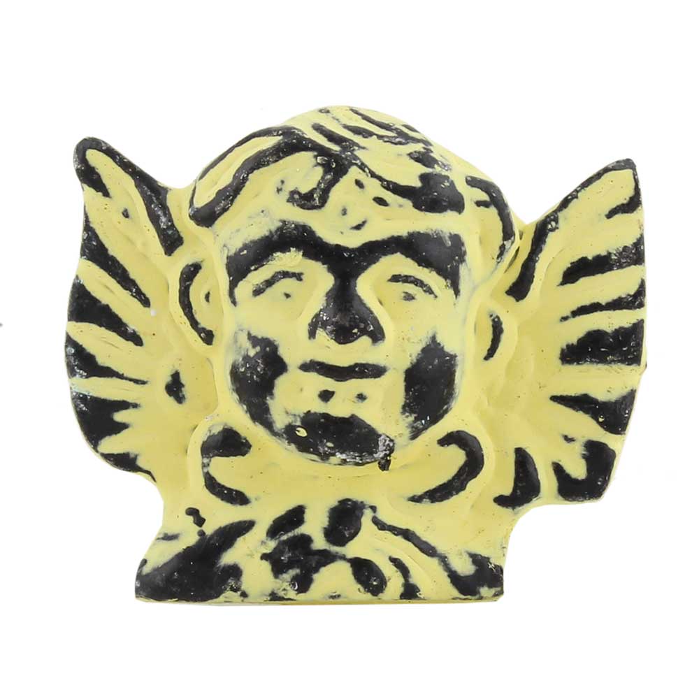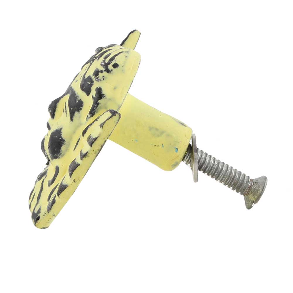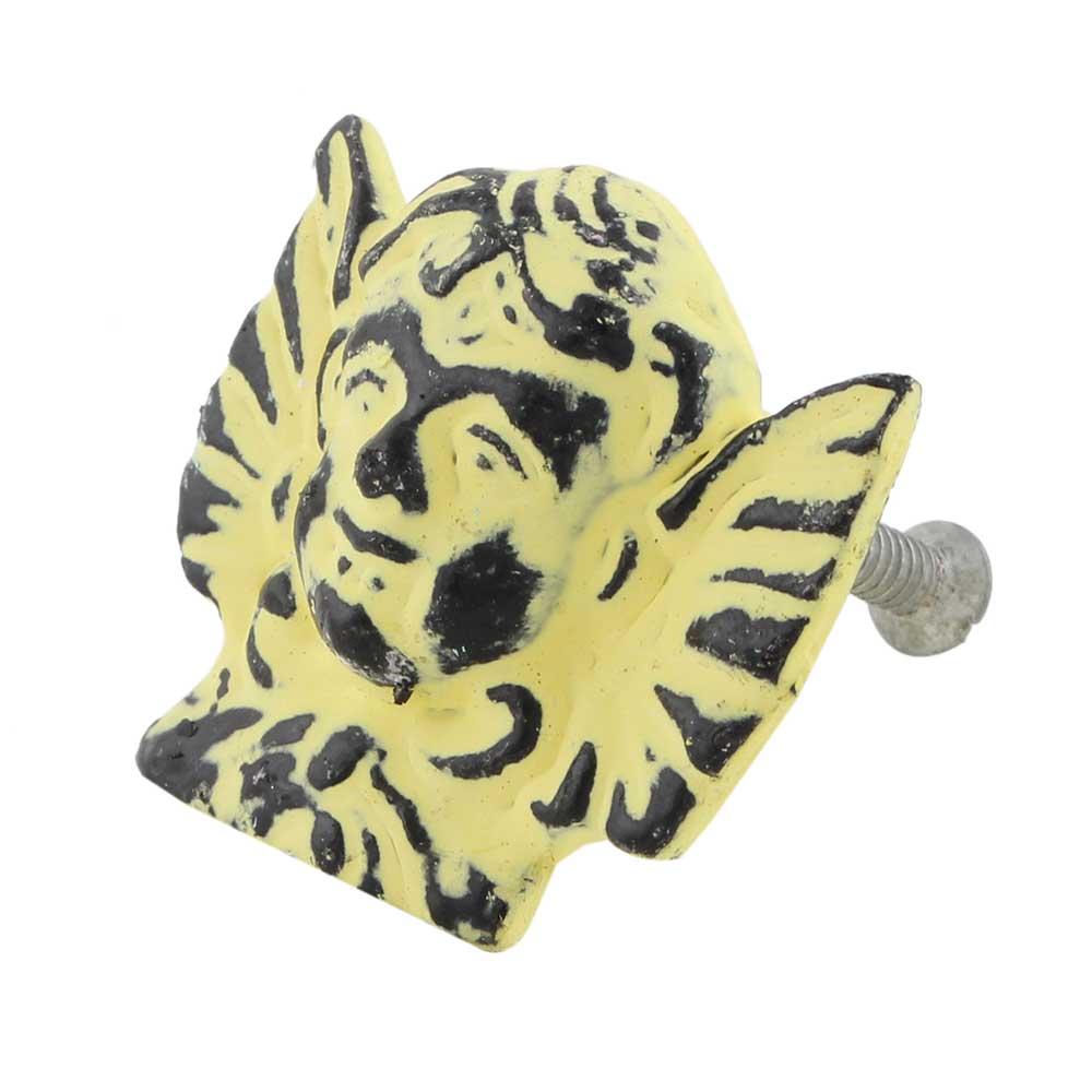 The Yellow Angel Distressed Iron Cabinet Knob features an intricate angelic design with a vibrant yellow color, bringing a touch of whimsy and elegance to any furniture piece. The antique distressed finish adds a rustic charm, making it a unique and eye-catching accent for your cabinetry.