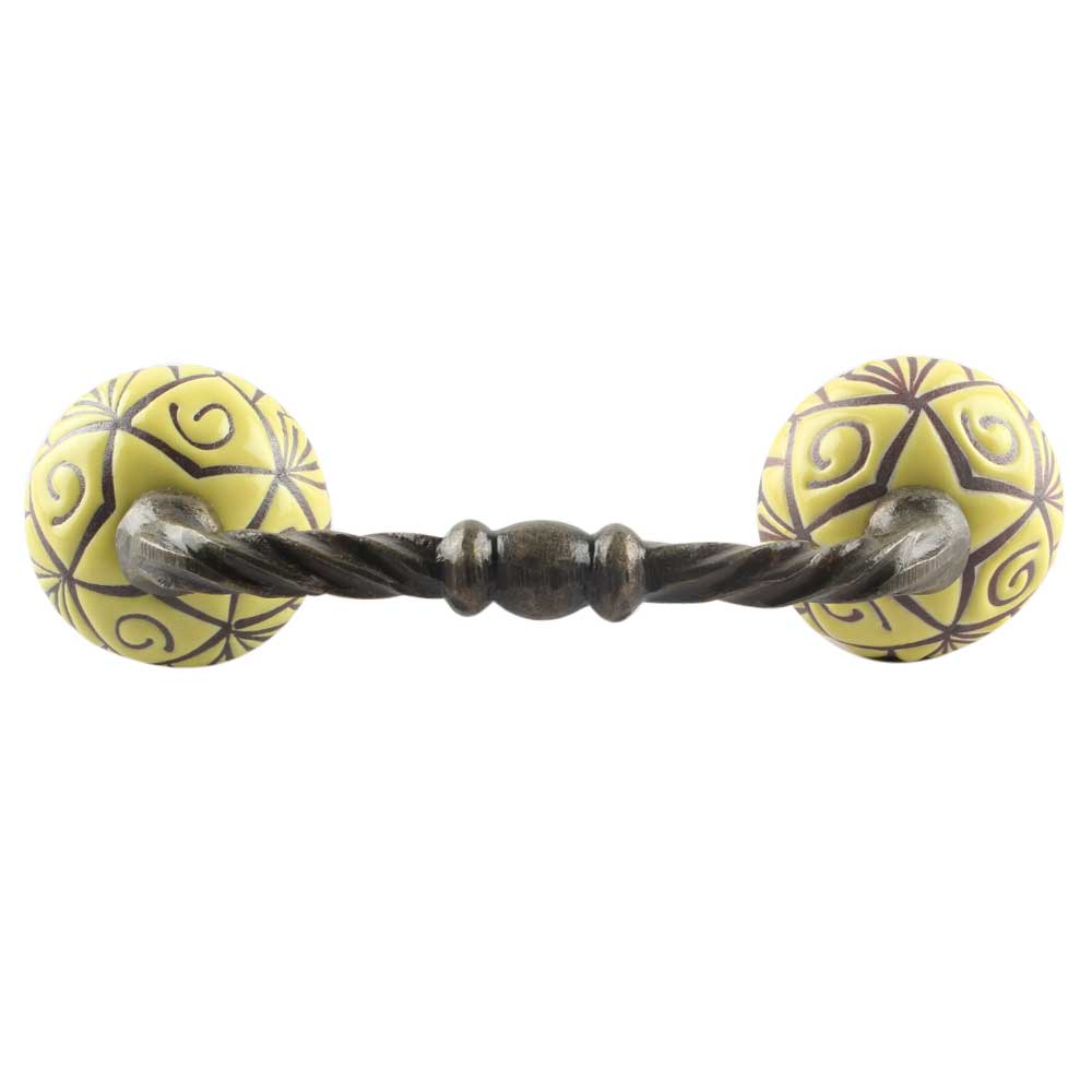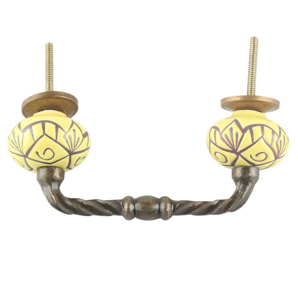 Yellow Base Brown Etched Ceramic Floral Cut Bridge Handle Online. Ideal for Drawer, Dresser, Cabinet, Wardrobe, Cupboard and Almirah etc.