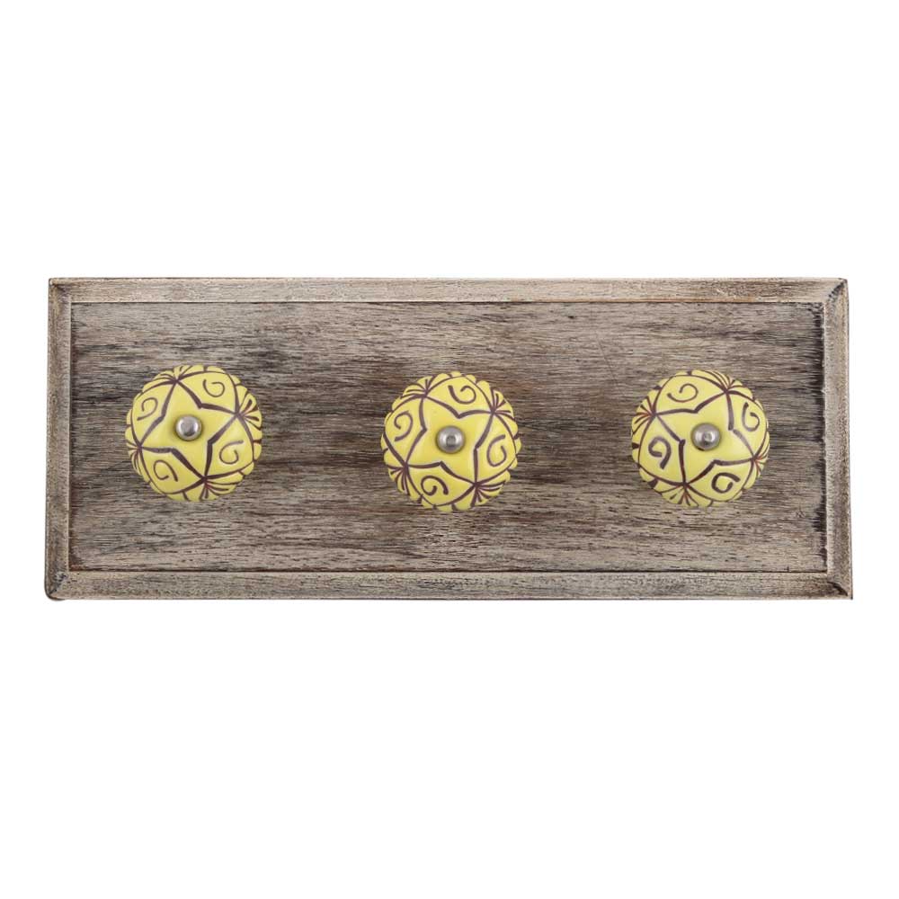 Yellow Base Brown Etched Ceramic Floral Wooden Hooks